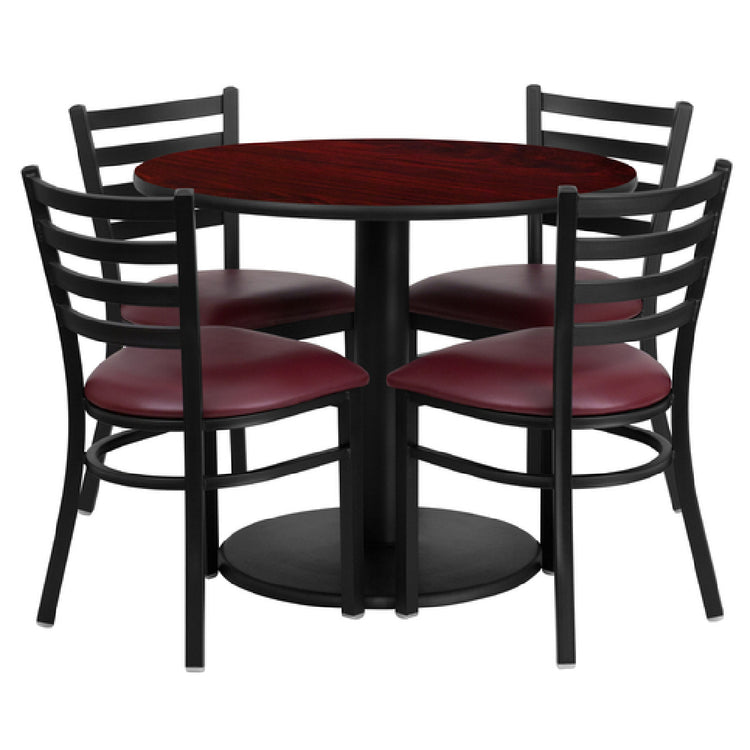 Flash Furniture RSRB1006-GG Table And Chair Set - an ideal choice for both residential and commercial environments, this set features a round table with a 36" diameter and 30" height. It boasts a black T-mold edge and is constructed with an MDF core layered in high-impact melamine, adorned with a mahogany laminate finish. The table rests on a sturdy cast iron round base with a black powder-coated finish, ensuring durability and stability. Accompanying the table are four chairs, each measuring 16-1/2" in width, 17" in depth, and 32-1/4" in height. These chairs are designed with a metal ladder back and feature burgundy vinyl upholstered padded seats, providing comfort with 2-1/2" thick CA117 fire retardant foam. The chairs' frames are crafted from 18-gauge steel with a black powder-coated finish, reinforced by welded joint assembly and curved support bar, ensuring lasting use. Plastic floor glides protect surfaces from scratches. This set requires assembly and ships in five boxes, with a lead time of 1-2 business days. It is an excellent investment for those seeking a blend of style, functionality, and resilience, suitable for various settings, from dining rooms to bustling commercial spaces.