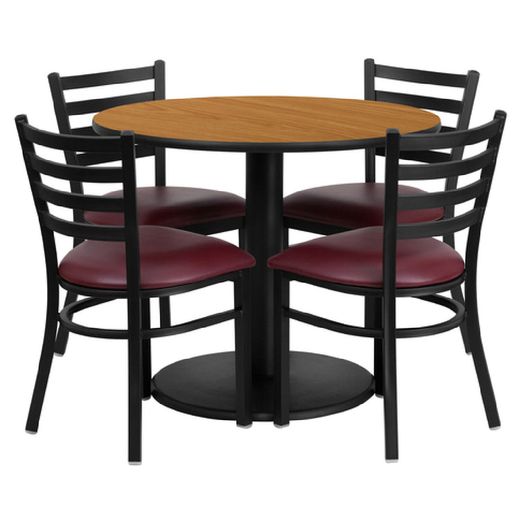 Flash Furniture, RSRB1007-GG, Table and Chair Set, includes (1) 36" dia. x 30"H table, round, black T-mold edge, MDF with high impact melamine core, natural laminate finish, cast iron round base with black powder coated finish, (4) 16-1/2"W x 17"D x 32-1/4"H chairs, metal ladder back, burgundy vinyl upholstered padded seat, 2-1/2" thick CA117 fire retardant foam, welded joint assembly, curved support bar, 18 gauge steel black powder coated frame, plastic floor glides, designed for residential and commercial use (assembly required) (shipped in 5 boxes) (1-2 business days lead time)