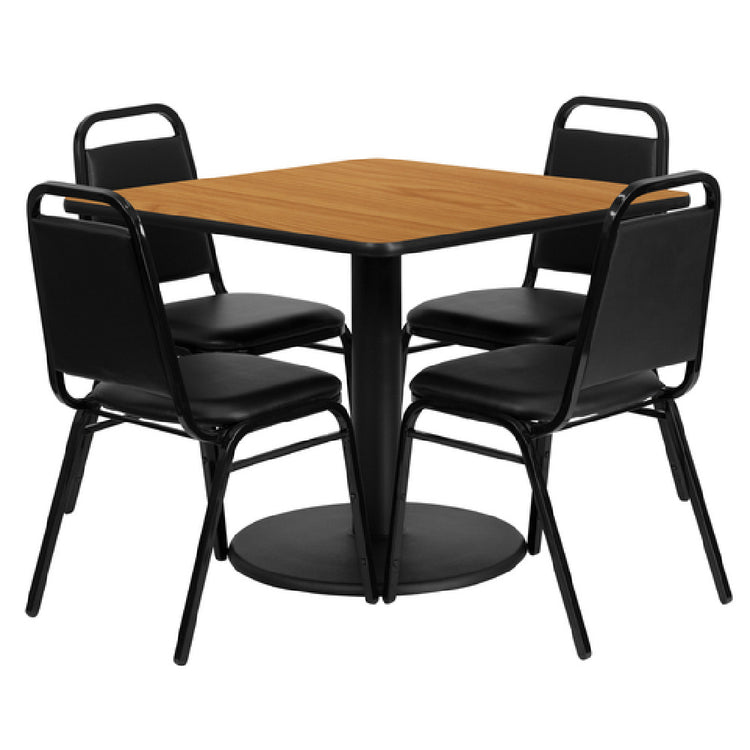 Flash Furniture RSRB1011-GG Table And Banquet Chair Set includes a 36"W x 36"D x 30"H table with a square design and a black T-mold edge for durability. The table is crafted from MDF with a high-impact melamine core and features a natural laminate finish enhancing its aesthetic appeal. It rests on a sturdy cast iron round base with a black powder-coated finish, ensuring stability and longevity. Accompanying the table are four banquet chairs, each measuring 17-1/2"W x 20-1/4"D x 34"H, with a robust weight capacity of 500 lbs. These chairs feature a trapezoidal seamless back panel and are upholstered in black vinyl for both comfort and style. The 1-1/2" thick CA117 fire retardant foam provides additional safety and comfort. Each chair is engineered with double support braces and plastic bumper guards, supported by a 16-gauge steel frame with a black powder-coated finish for enhanced durability. Plastic floor glides protect surfaces from scratches, making this set suitable for both commercial and residential use. Shipped in four boxes with a lead time of 1-2 business days, this set requires assembly and promises to be a versatile addition to any dining or event space.