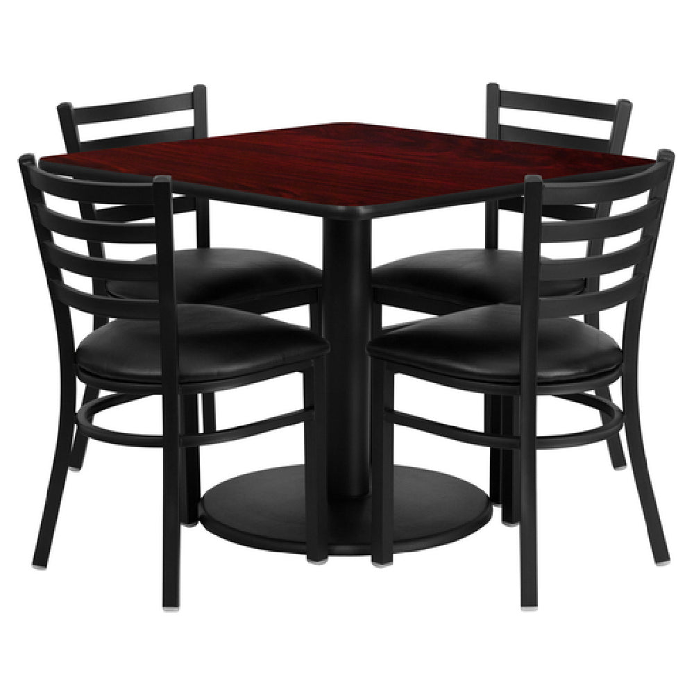 Flash Furniture RSRB1014-GG Table and Chair Set is a comprehensive furniture solution designed for both residential and commercial spaces. This set includes a 36"W x 36"D x 30"H table, which features a black T-mold edge and a durable MDF with high-impact melamine core. The table's mahogany laminate finish is complemented by a robust cast iron round base with a black powder-coated finish. Accompanying the table are four chairs, each measuring 16-1/2"W x 17"D x 32-1/4"H. The chairs boast a metal ladder back design and are equipped with burgundy vinyl upholstered padded seats, incorporating 2-1/2" thick CA117 fire retardant foam for added safety and comfort. The welded joint assembly and curved support bar enhance the chairs’ durability, while the 18-gauge steel frame, finished with black powder coating, ensures longevity. Practical features include plastic floor glides to protect flooring surfaces. Delivered in five boxes with a 1-2 business days lead time, the set requires assembly. This versatile furniture set, designed for various market segments, seamlessly blends functionality with style, making it an ideal choice for dining areas, cafes, and meeting rooms.