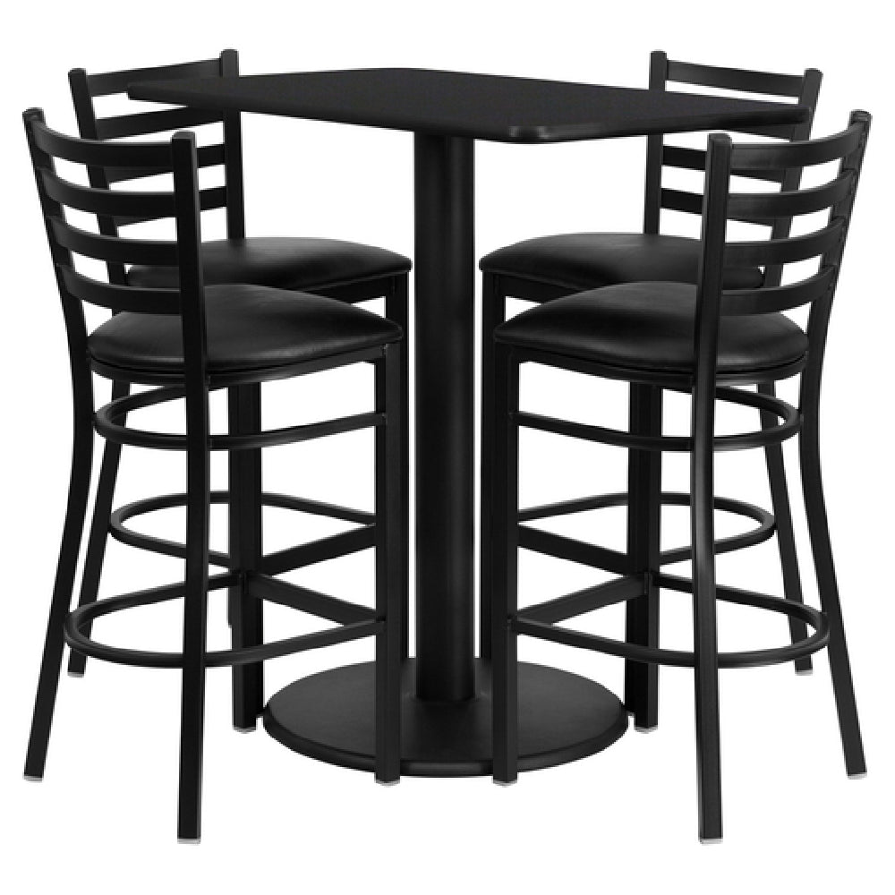 The Flash Furniture RSRB1017-GG Table and Bar Stool Set is a comprehensive furnishing solution designed for both commercial and residential environments. This set includes a table with dimensions of 24"W x 42"D x 42"H, featuring a square shape with a durable black T-mold edge. The table is constructed from medium-density fiberboard (MDF) with a high-impact melamine core and finished with a sleek black laminate. Its stability is ensured by a cast iron round base with a black powder coat finish. Accompanying the table are four bar stools, each measuring 17"W x 18"D x 42-1/4"H. These stools are designed with a metal ladder back and are upholstered with black vinyl padded seats, offering comfort with 2-1/2" thick CA117 fire retardant foam. The stools feature welded joint assembly, two curved support bars, a footrest, and an 18 gauge steel clear-coated frame. Plastic floor glides provide scratch-free mobility on various surfaces. This set requires assembly and is shipped in five boxes, with a lead time of 1-2 business days. It is crafted to serve diverse market segments, from restaurant settings to home bar areas, blending functionality and style seamlessly.