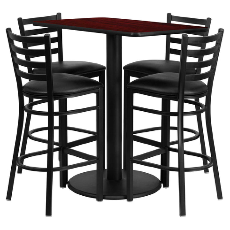 Flash Furniture RSRB1018-GG Table and Bar Stool Set offers a comprehensive dining solution designed for both commercial and residential spaces. The set includes a 24"W x 42"D x 42"H table, featuring a square design with a durable black T-mold edge. Crafted from MDF with a high-impact melamine core, it is finished with a mahogany laminate, supported by a cast iron round base with a black powder coat finish. This set also comprises four bar stools, each measuring 17"W x 18"D x 42-1/4"H. The stools are equipped with a metal ladder back and a black vinyl upholstered padded seat, enhanced by 2-1/2" thick CA117 fire retardant foam for added comfort and safety. Constructed with a welded joint assembly, the stools include two curved support bars and a footrest for stability. The 18 gauge steel frame is clear coated for durability, and plastic floor glides protect surfaces. This versatile furniture set is designed to cater to the needs of various market segments, being both aesthetically appealing and functional. The product is shipped in five boxes and requires assembly, with a lead time of 1-2 business days, ensuring a quick setup for immediate use.