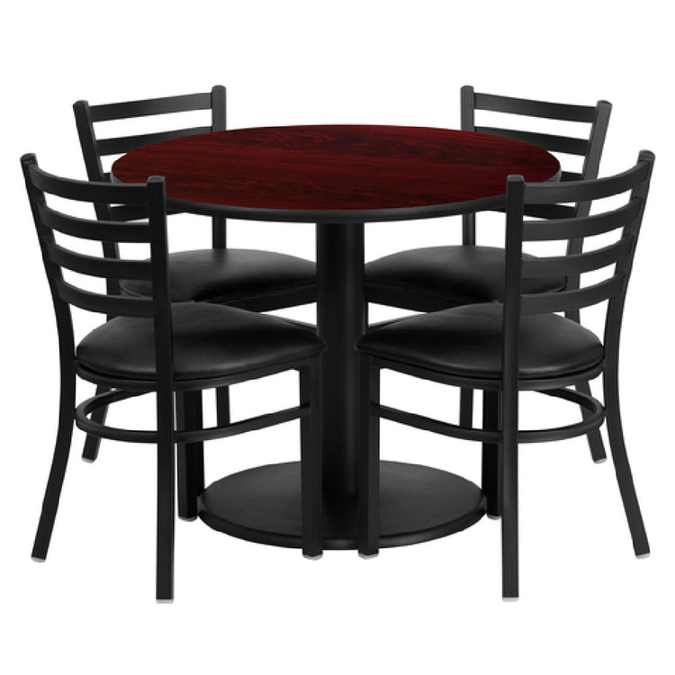 The Flash Furniture RSRB1030-GG Table And Chair Set is an expertly designed ensemble, ideal for both residential and commercial environments. The set features a 36" diameter round table standing at 30" high, crafted with a black T-mold edge and a mahogany laminate finish. The table's top is made from medium-density fiberboard (MDF) with a high-impact melamine core, ensuring durability and a sophisticated appearance. Its base is constructed from cast iron with a black powder-coated finish, offering stability and strength. Accompanying the table are four chairs, each measuring 16-1/2" wide, 17" deep, and 32-1/4" high. These chairs are built with a metal ladder back design and include black vinyl upholstered padded seats filled with 2-1/2" thick CA117 fire retardant foam for enhanced safety and comfort. Their welded joint assembly and curved support bar add to their robust construction, while an 18-gauge steel black powder-coated frame ensures longevity. Plastic floor glides are included to protect surfaces. This set requires assembly and is conveniently shipped in five boxes, with a lead time of 1-2 business days. Its design and materials make it a practical choice for those seeking a blend of style, functionality, and durability in various settings.
