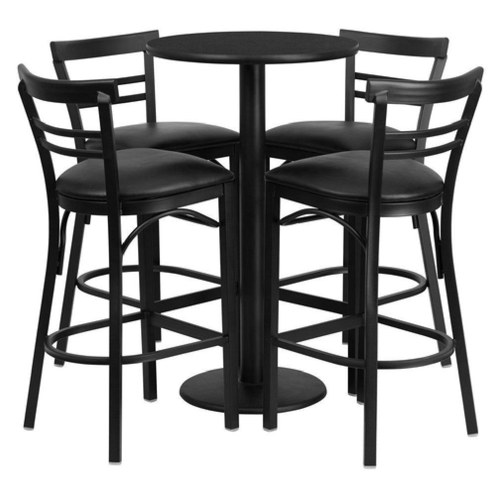 The Flash Furniture RSRB1033-GG Table and Bar Stool Set is an ideal choice for both commercial and residential environments, combining durability and style. The set includes a 24" diameter x 42" height table that features a round design with a black T-mold edge and an MDF core layered with high-impact melamine for enhanced durability. Its black laminate finish and sturdy cast iron round base with black powder-coated finish ensure long-lasting use. Accompanying the table are four bar stools, each with dimensions of 17" width x 19" depth x 41-3/4" height. These stools boast a sleek metal ladder back design and a black vinyl upholstered padded seat for comfort, supported by 2-1/2" thick CA117 fire retardant foam for safety. They are constructed with an 18-gauge steel frame that is also powder-coated in black for resilience. The welded joint assembly and two curved support bars, along with a footrest, enhance stability and user comfort. Additionally, plastic floor glides protect surfaces from damage. This set is designed with versatility in mind, suitable for diverse market segments seeking functional and stylish furniture solutions. Assembly is required, and the product ships in five boxes with a lead time of 1-2 business days.