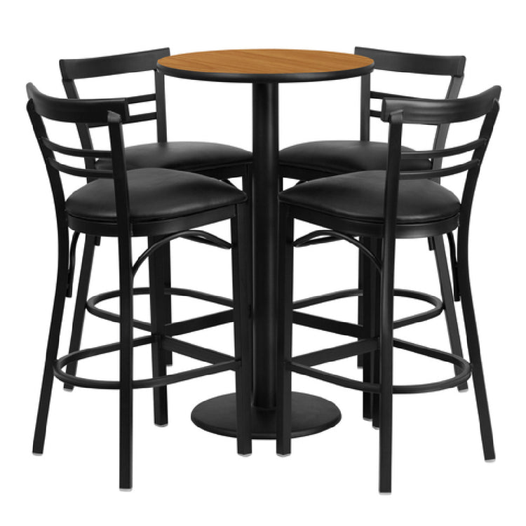 The Flash Furniture RSRB1035-GG Table And Bar Stool Set includes a 24-inch diameter by 42-inch high table, expertly crafted with a round, black T-mold edge. Its construction features a high-impact melamine core and a natural laminate finish, supported by a robust cast iron round base with a sleek black powder-coated finish, providing stability and durability. Accompanying the table are four bar stools, each measuring 17 inches wide by 19 inches deep by 41-3/4 inches high. These stools boast a stylish metal ladder back design and a black vinyl upholstered padded seat, which is enhanced by a 2-1/2-inch thick CA117 fire-retardant foam for added safety and comfort. The stools' welded joint assembly, along with two curved support bars and a footrest, ensures structural integrity and user comfort. Constructed with an 18-gauge steel frame, also finished with black powder coating, these stools are equipped with plastic floor glides to protect flooring surfaces. Designed for both commercial and residential use, this set requires assembly and is conveniently shipped in five boxes with a lead time of 1-2 business days. This versatile table and bar stool set seamlessly combines functionality and style, making it a valuable addition to any space.
