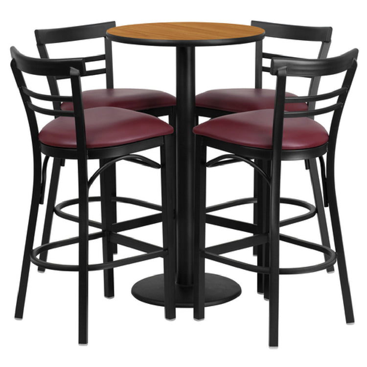 The Flash Furniture RSRB1039-GG Table and Bar Stool Set includes a robust combination of a 24" diameter x 42" height table and four bar stools, making it a versatile choice for various settings. The table features a round design with a durable black T-mold edge and a high-impact melamine core, finished in a natural laminate for an elegant look. Its stability is ensured by a cast iron round base with a sleek black powder-coated finish. Accompanying the table are four bar stools, each measuring 17" width x 19" depth x 41-3/4" height, equipped with metal ladder backs and padded seats upholstered in burgundy vinyl. The seats are generously padded with 2-1/2" thick CA117 fire retardant foam, providing comfort and safety. The stools' structure is reinforced with welded joint assembly and two curved support bars, plus a footrest for added convenience. Their frames are constructed from 18-gauge steel with a black powder-coated finish, complete with plastic floor glides to protect flooring. This set is designed for both commercial and residential use, requiring assembly and shipped in five boxes with a lead time of 1-2 business days, perfectly balancing functionality and style for diverse environments.