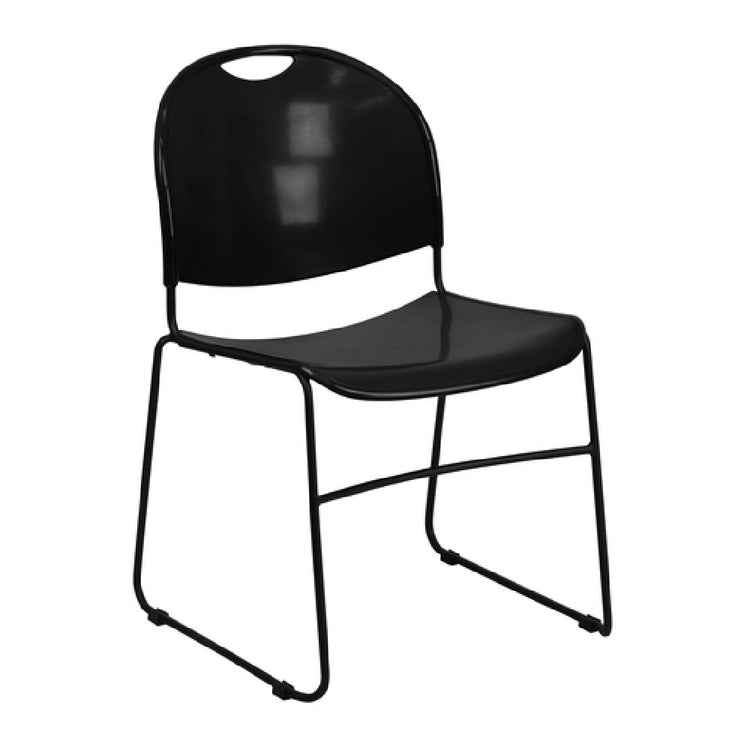 The Flash Furniture RUT-188-BK-GG Hercules Series Ultra Compact Stacking Chair is engineered to withstand a substantial load with its impressive 880 lb. weight capacity, making it an ideal choice for diverse environments. Its ergonomic design features a no-fade polypropylene seat and back, ensuring lasting color and comfort. A convenient carrying handle cutout enhances portability, while the textured seat offers additional comfort. The chair's supportive front cross brace and black powder-coated metal sled base frame, constructed from 12 x 1.8mm metal gauge, provide durability and stability. Designed for indoor and outdoor commercial use, it is equipped with plastic floor glides to protect surfaces. This chair's unique value lies in its ability to stack up to 35 chairs high, optimizing space in any setting. Available in black, it ships fully assembled, and in-stock items typically ship within 24 hours. The Hercules Series chair is an exceptional choice for hotels, conference centers, and educational institutions seeking reliable, space-efficient seating solutions.