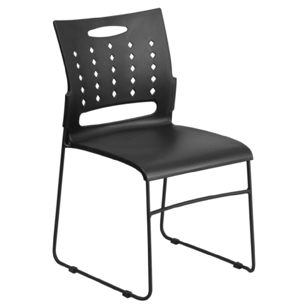 The Flash Furniture RUT-2-BK-GG Hercules Series Stacking Chair 881 Lb. Weight Capacity is an exceptional seating solution engineered for both comfort and durability, making it ideal for various commercial settings. This ergonomically designed chair features a sturdy plastic seat and back, enhanced by a perforated backrest that promotes airflow for added comfort. A convenient carrying handle cutout is integrated for easy transport, while the supportive front cross brace ensures maximum stability. The chair's robust black powder-coated metal sled base frame provides a sleek and modern aesthetic, complemented by plastic floor glides that protect flooring surfaces. With an impressive weight capacity of 881 pounds, this chair is built to accommodate a wide range of users. Designed for indoor and outdoor use, it stands out in versatile environments such as conference halls, event venues, and dining establishments. Furthermore, the chair's ability to stack up to 5 units high optimizes storage efficiency, and it ships fully assembled, saving valuable time and effort. The Flash Furniture RUT-2-BK-GG Hercules Series Stacking Chair is a reliable and practical choice for businesses seeking a durable seating option that combines functionality with a professional appearance. The product is typically available for quick dispatch, with in-stock items shipping within 24 hours.