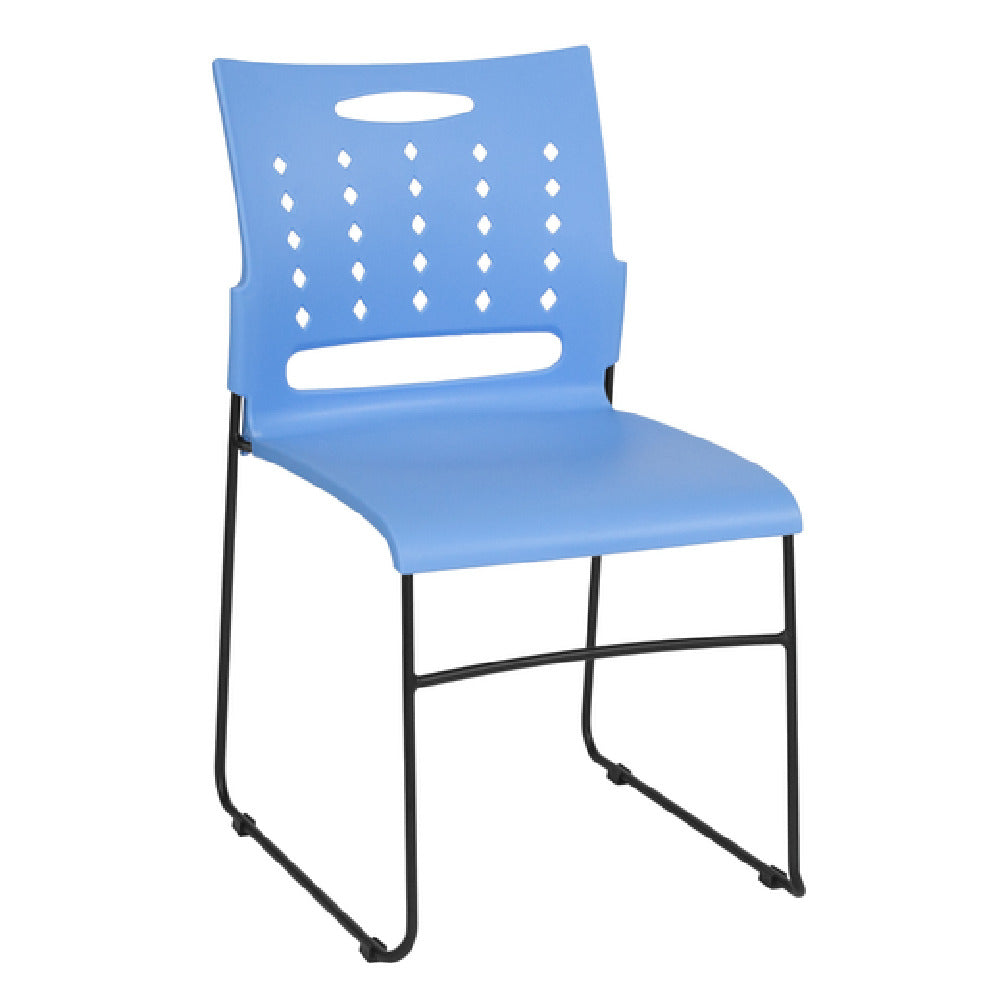 The Flash Furniture RUT-2-BL-GG Hercules Series Stacking Chair is a highly durable seating solution, boasting an impressive weight capacity of 881 lbs. This ergonomic chair is designed to cater to various commercial settings, both indoors and outdoors. Featuring a sturdy black powder-coated metal sled base frame, it is built to withstand substantial usage. The chair includes a plastic seat and back, ensuring comfort and ease of maintenance. Its perforated back promotes air circulation, enhancing user comfort during extended periods of sitting. A carrying handle cutout adds to its practicality, facilitating easy transportation and arrangement. This model incorporates a supportive front cross brace, contributing to its structural integrity. Designed with plastic floor glides, it protects surfaces from scratches and wear. This Hercules chair is stackable up to five chairs high, optimizing space efficiency in storage and transportation. Each unit ships fully assembled, and in-stock items typically ship within 24 hours, ensuring quick delivery. With its blue finish, the chair adds a touch of color to any environment while maintaining a professional appearance. Ideal for businesses seeking reliable and versatile seating, this product embodies durability and functionality for various market segments.