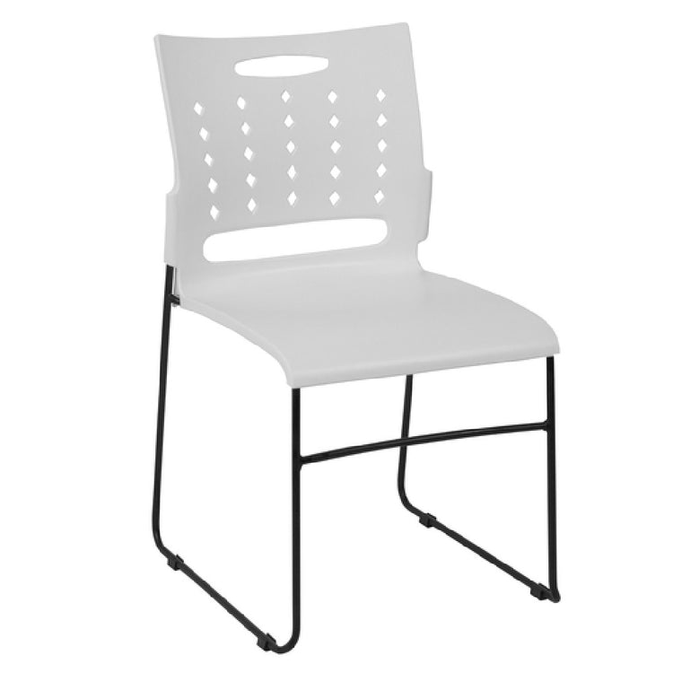 The Flash Furniture RUT-2-WH-GG Hercules Series Stacking Chair is a versatile seating solution designed to accommodate a wide range of environments, with an impressive weight capacity of 881 lb. This chair features an ergonomic design, providing comfort with a durable plastic seat and back. Its unique design includes a carrying handle cutout for ease of transport and a perforated back to enhance airflow and user comfort. The chair's structural integrity is reinforced by a supportive front cross brace and a sturdy black powder-coated metal sled base frame. The inclusion of plastic floor glides ensures the chair can be used on various surfaces without causing damage, making it suitable for both indoor and outdoor commercial use. The RUT-2-WH-GG model is designed for efficient storage, stacking up to five chairs high, and is available in a clean white color. For convenience, the chair ships fully assembled, often within 24 hours for in-stock items. Its combination of strength, functionality, and easy maintenance makes it an ideal choice for various market segments, including hospitality, education, and event spaces, where durability and practicality are paramount.