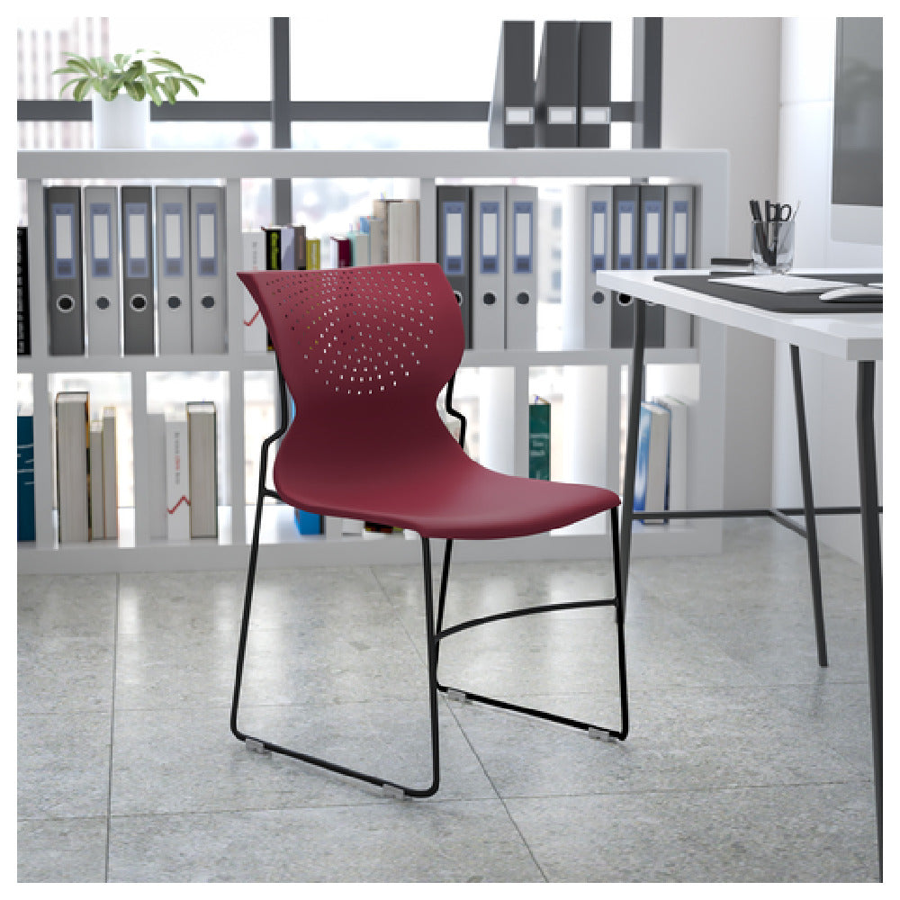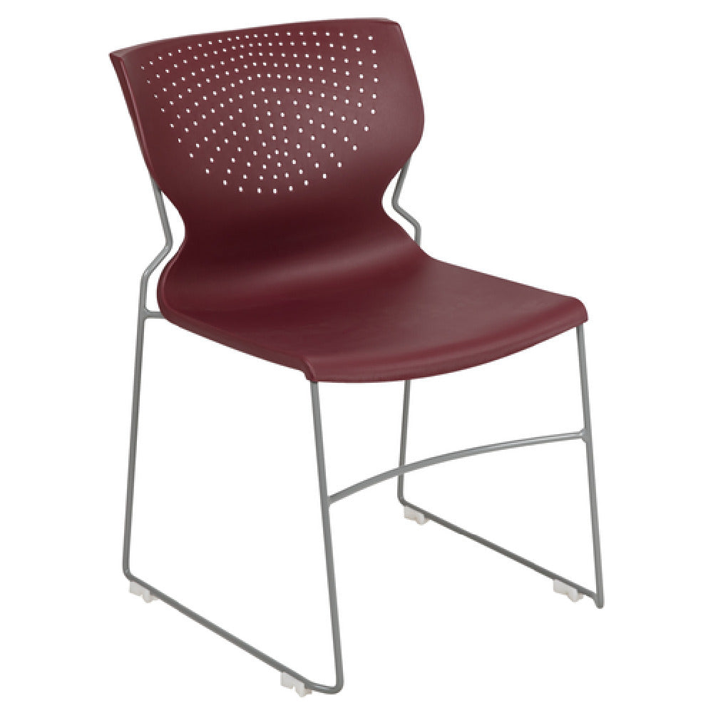 The Flash Furniture RUT-438-BY-GG Hercules Series Stacking Chair - 661 Lb. Weight Capacity is an ergonomic seating solution designed for versatile use in both indoor and outdoor commercial environments. Featuring a burgundy polypropylene seat and full back, this chair offers both comfort and durability. Its curved perforated back enhances breathability and provides ergonomic support, making it suitable for extended use in various settings such as conference rooms, event spaces, and cafeterias. The chair's design includes a supportive front cross brace and a robust gray powder-coated metal sled base frame, ensuring stability and longevity. With plastic floor glides, it protects flooring surfaces, while the ganging floor clips offer easy connectivity for cohesive seating arrangements. This chair is remarkably efficient in storage, stacking up to 25 chairs high, which is ideal for businesses that require space-saving solutions. Notably, it ships fully assembled, allowing for immediate use. Its impressive weight capacity of 661 lb. underscores its durability and suitability for a wide range of users. The Flash Furniture RUT-438-BY-GG Hercules Series Stacking Chair is readily available, with in-stock items typically shipping within 24 hours, providing a seamless purchasing experience for businesses looking to enhance their seating options.