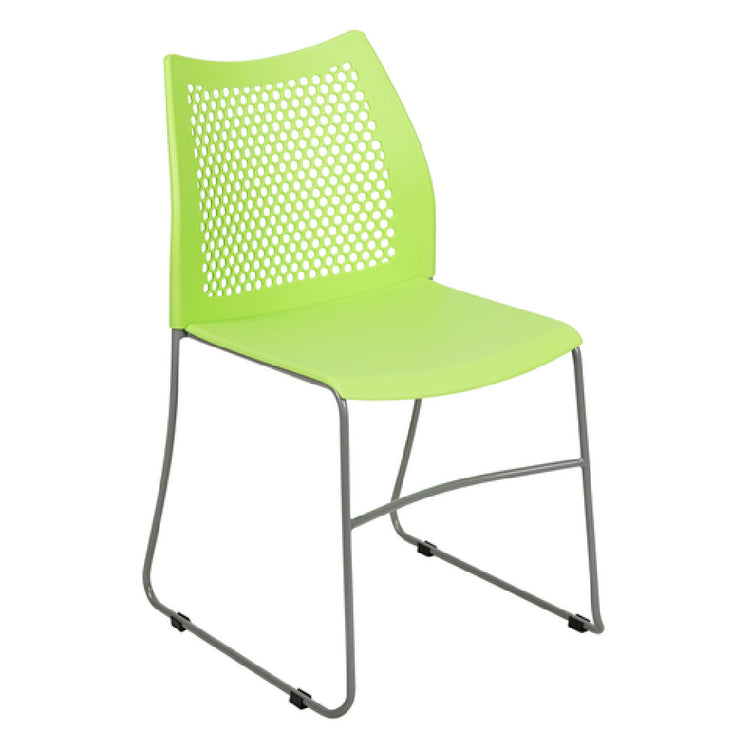 The Flash Furniture RUT-498A-GN-GG Hercules Series Stacking Chair is an exemplary seating solution with a remarkable weight capacity of 661 lbs, catering to both indoor and outdoor commercial environments. This chair is distinguished by its ergonomic design, featuring a plastic seat and back with a perforated backrest that enhances airflow and comfort during prolonged use. The chair's structural integrity is bolstered by a supportive front cross brace and a gray powder-coated metal sled base frame, ensuring stability and durability. Plastic floor glides protect surfaces from scratches and scuffs, making it suitable for various floor types. Its stackable nature allows for up to 5 chairs to be stacked high, optimizing storage and space efficiency. Available in a vibrant green color, this chair arrives fully assembled, facilitating immediate use. Typically, in-stock items ship within 24 hours, ensuring prompt delivery. The Flash Furniture RUT-498A-GN-GG chair is a versatile choice for any setting, offering a blend of functionality and modern design, meeting the diverse needs of the hospitality, event, and corporate sectors with ease.