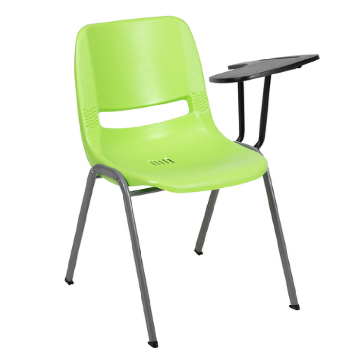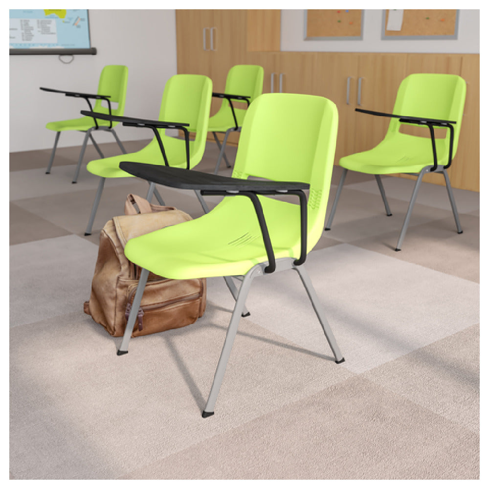 The Flash Furniture RUT-EO1-GN-LTAB-GG Hercules Series Ergonomic Shell Chair is engineered to support an impressive 880 lb. weight capacity, making it a reliable choice across various settings, from educational institutions to corporate environments. This chair features a 12-inch wide by 17-inch deep flip-up left-handed plastic tablet arm, complete with a pencil groove, enhancing its functionality for note-taking or digital device use. The plastic seat and back are designed for durability and comfort, while the vented back and seat drain holes ensure breathability and easy maintenance. For added stability, the chair is constructed with double support rails and a gray powder-coated metal frame, utilizing a 15 x 30 x 1.2mm metal gauge for strength. Plastic floor glides protect flooring surfaces and facilitate smooth movement. Presented in a vibrant green color, this chair requires assembly and typically ships within 24 hours for in-stock items. The Flash Furniture RUT-EO1-GN-LTAB-GG is a versatile seating solution, offering ergonomic support and robust construction, tailored for the demands of high-traffic areas such as classrooms, conference rooms, and auditoriums.
