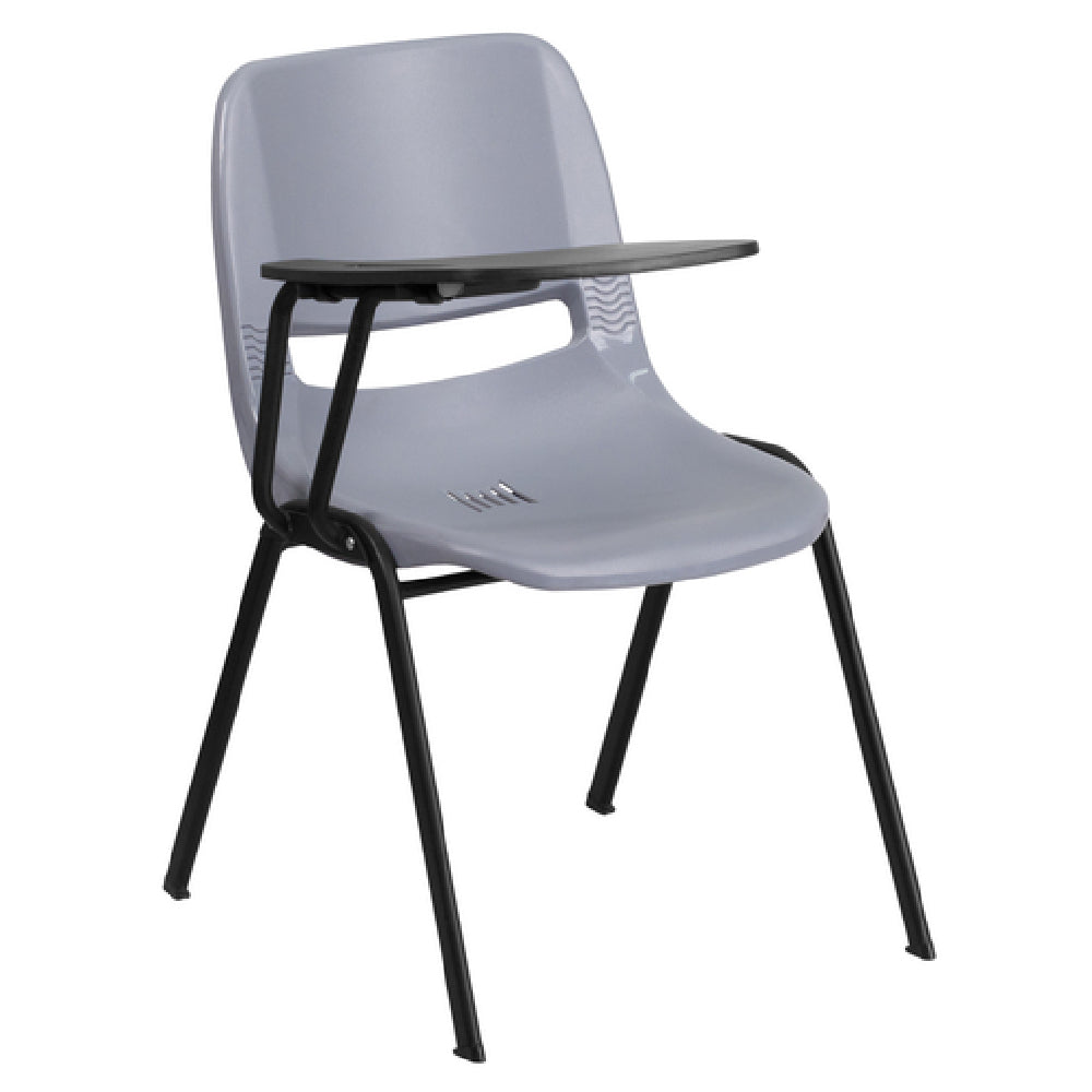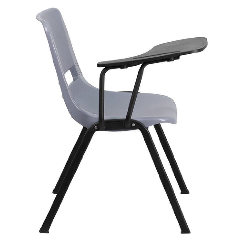 The Flash Furniture RUT-EO1-GY-RTAB-GG Hercules Series Ergonomic Shell Chair - 880 lb. weight capacity is designed to provide exceptional durability and comfort across a multitude of environments. This chair features a 12-inch wide by 17-inch deep flip-up right-handed plastic tablet arm with a convenient pencil groove, making it a practical choice for educational settings, training rooms, and lecture halls. The chair's plastic seat and back are designed with a vented back to promote airflow and seat drain holes to prevent moisture build-up, enhancing user comfort. It is constructed with double support rails for enhanced stability and a black powder-coated metal frame made of 15 x 30 x 1.2mm metal gauge, ensuring long-lasting strength. The ergonomic design caters to a broad range of users with its impressive weight capacity. Additionally, the chair includes plastic floor glides to protect floors from scratches and facilitate easy movement. Available in a sleek gray color, this chair requires assembly and ships swiftly, with most in-stock items dispatched within 24 hours. The Flash Furniture Hercules Series Ergonomic Shell Chair combines robust construction with practical features, making it a valuable addition to any professional or educational space.