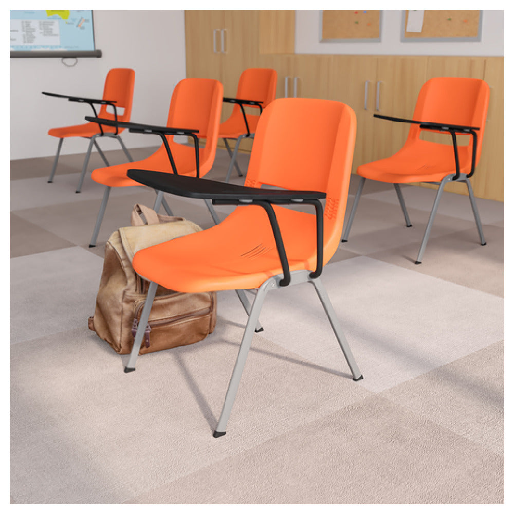 The Flash Furniture RUT-EO1-OR-LTAB-GG Hercules Series Ergonomic Shell Chair is a robust seating solution, boasting an impressive 880 lb. weight capacity. Crafted for durability and comfort, this chair features a plastic seat and back with a vented back design to promote airflow. The 12"W x 17"D flip-up left-handed plastic tablet arm, complete with a pencil groove, adds functionality, making it a versatile option for educational environments, lecture halls, and training sessions. Its double support rails provide additional stability, ensuring long-term resilience. The chair is equipped with seat drain holes, enhancing user comfort and maintenance ease. Structured with a gray powder-coated metal frame, the chair's 15 x 30 x 1.2mm metal gauge underscores its sturdy construction. Plastic floor glides protect floors from scratches and enable smooth movement. Presented in a vibrant orange finish, this chair requires assembly upon delivery. Suitable for diverse market segments, including educational institutions, corporate training facilities, and conference centers, the Flash Furniture RUT-EO1-OR-LTAB-GG chair is in stock and typically ships within 24 hours, offering a practical and dynamic seating solution for various professional settings.
