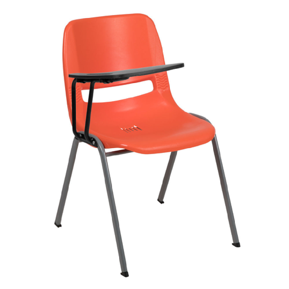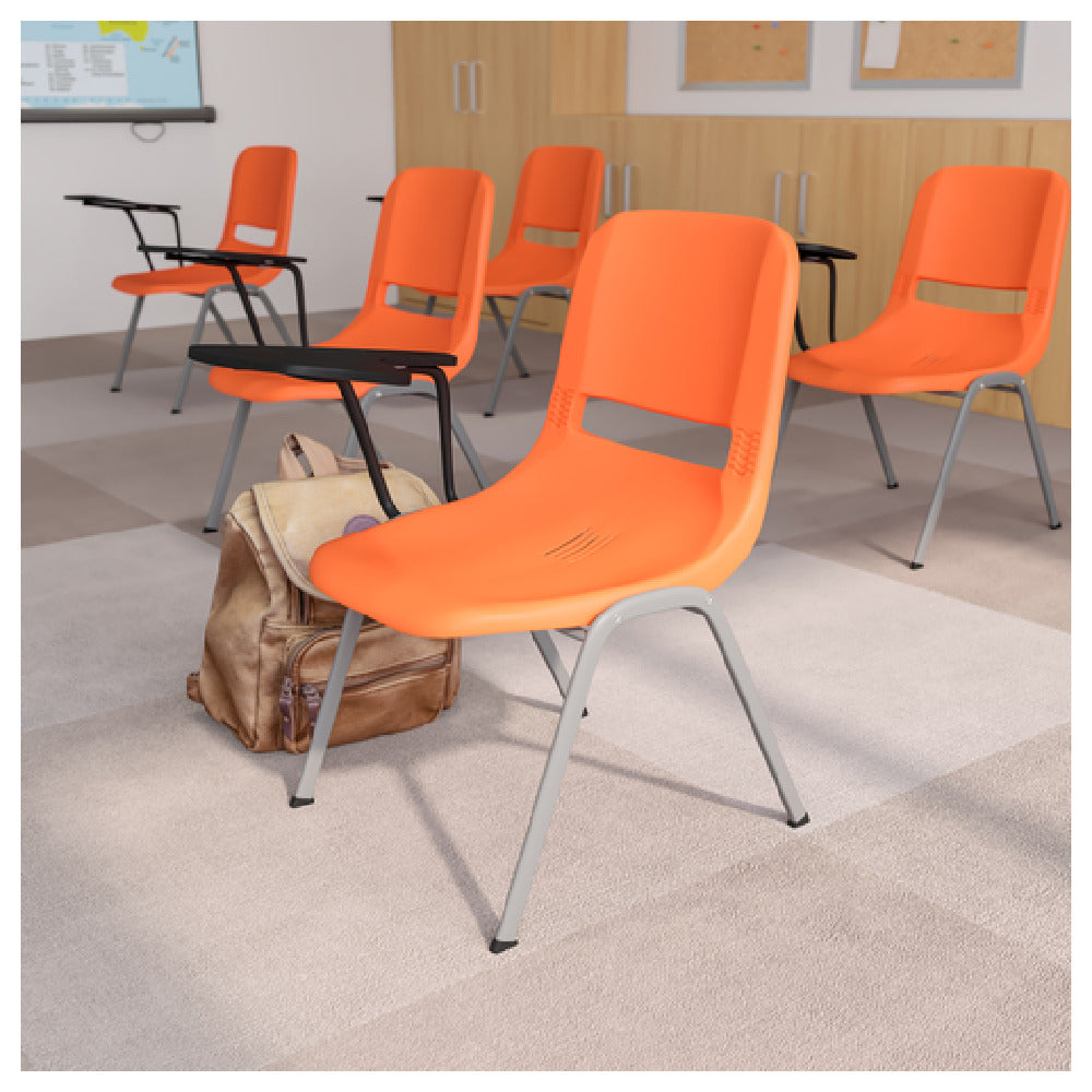 The Flash Furniture RUT-EO1-OR-RTAB-GG Hercules Series Ergonomic Shell Chair is a versatile seating solution designed to accommodate a remarkable 880 lb. weight capacity, making it suitable for diverse settings from educational institutions to professional environments. This chair features a 12-inch wide by 17-inch deep flip-up right-handed plastic tablet arm equipped with a convenient pencil groove, enhancing functionality for note-taking or device usage. Constructed with a durable plastic seat and back, it includes a vented back design to offer comfort during extended use. The chair's seat is intelligently designed with drain holes, ensuring easy maintenance and longevity. Supported by double support rails, the robust gray powder-coated metal frame, with a 15 x 30 x 1.2mm metal gauge, provides enhanced stability and durability. Plastic floor glides are affixed to protect floors and facilitate smooth movement. Available in an eye-catching orange color, this chair requires assembly upon delivery. In stock items typically ship within 24 hours, ensuring quick availability. Ideal for various industry segments, such as educational, corporate, and event settings, the Flash Furniture Hercules Series Ergonomic Shell Chair combines ergonomic comfort with practical functionality, making it a valuable asset for any dynamic seating arrangement.