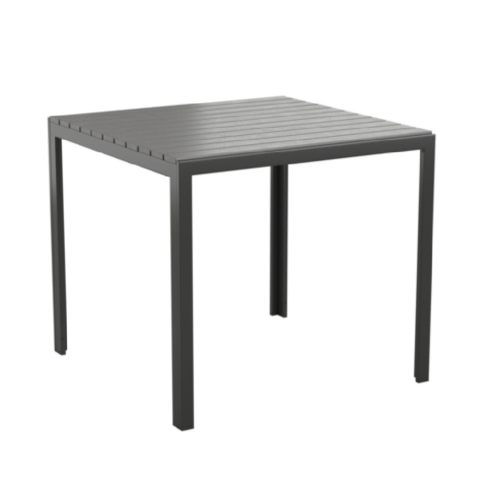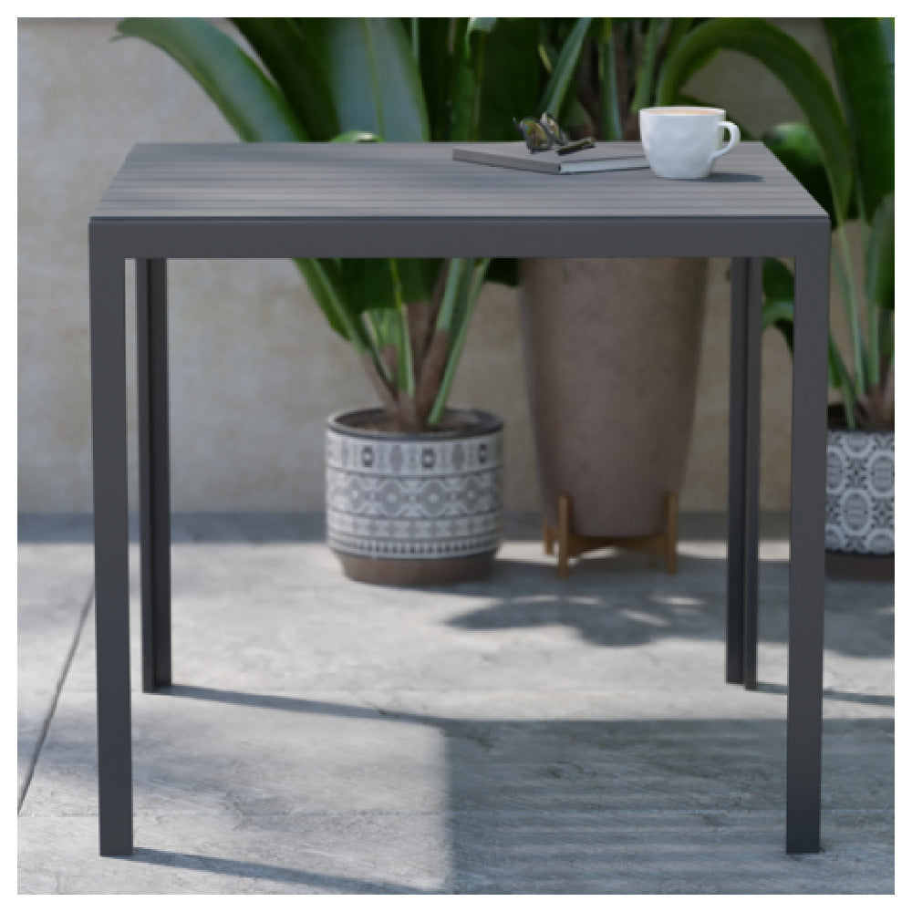 The Flash Furniture SB-A268T-BK-GG Harris Patio Dining Table 31-1/2"W x 31-1/2"D x 28-3/4"H Square Table is a versatile addition to any space, offering a balance of style and functionality for both indoor and outdoor settings. This square table features a poly resin slatted top that not only enhances its aesthetic appeal but also ensures durability and easy maintenance. Supported by an e-coated steel frame, the table is designed to withstand various weather conditions, making it an ideal choice for patios and gardens. With a weight capacity of 200 lbs, it provides robust support for dining essentials. The fixed floor glides are engineered to offer stability on different surfaces, preventing unwanted movement and ensuring a safe dining experience. Finished in sleek black, this table seamlessly fits into various decor styles, whether modern or traditional. Its compact 31-1/2" x 31-1/2" dimensions make it suitable for smaller spaces while still providing ample dining surface. This product caters to homeowners seeking a reliable and stylish dining solution, as well as businesses in the hospitality industry looking for durable outdoor furniture options. The Flash Furniture SB-A268T-BK-GG is crafted to meet high standards of quality and practicality, making it a valuable asset for diverse environments.