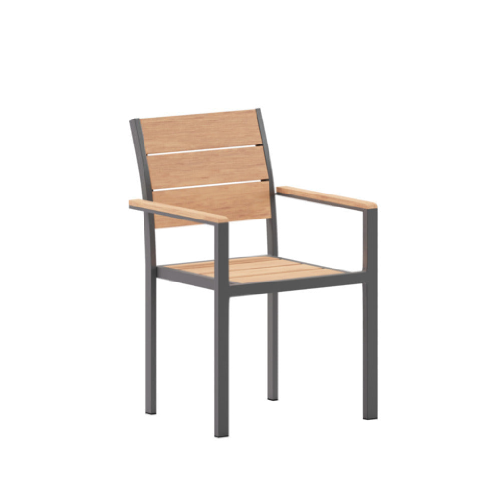 The Flash Furniture SB-CA108-WA-NAT-GG Finch Patio Chair is a versatile seating solution ideal for a variety of outdoor spaces, offering a generous 300 lbs weight capacity. This chair is designed with faux teak poly slats, which are both visually appealing and practical, providing a natural wood look with the durability and low maintenance of modern materials. The chair's metal frame ensures sturdiness and longevity, making it suitable for both residential and commercial use. One of its standout features is the ability to stack up to 8 chairs high, facilitating efficient storage and space management. The Finch Patio Chair includes arms for added comfort, enhancing the user experience for extended seating periods. Available in a sophisticated gray color, it seamlessly integrates into diverse outdoor settings. Notably, this chair requires no assembly, allowing for immediate use upon delivery. Its combination of style, durability, and convenience makes the Flash Furniture SB-CA108-WA-NAT-GG Finch Patio Chair a valuable asset for anyone looking to enhance their outdoor seating arrangements, whether for personal use or in hospitality venues.