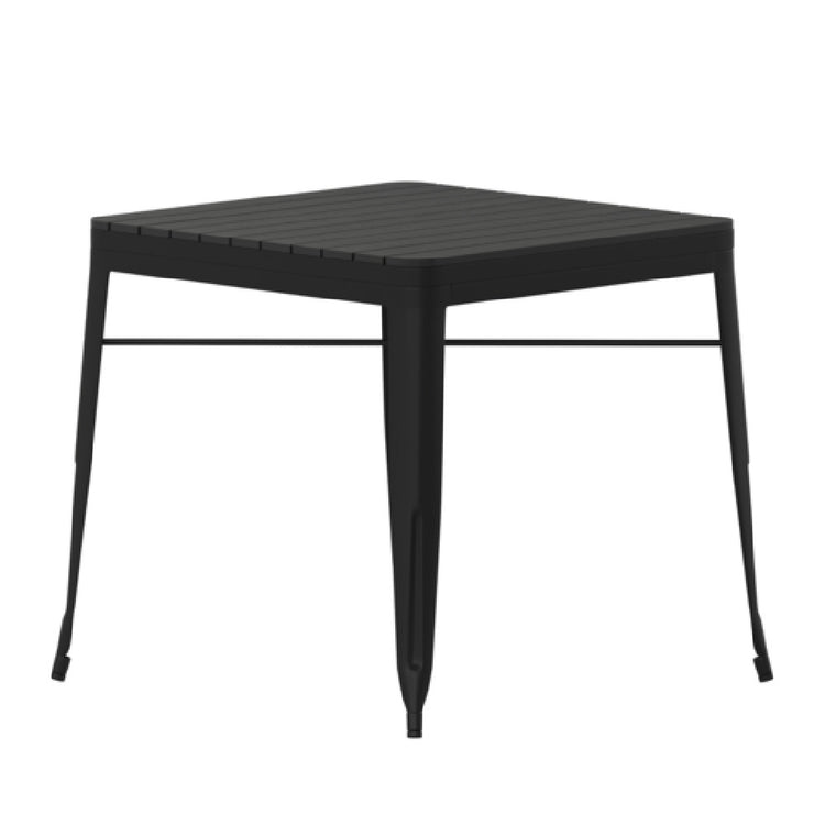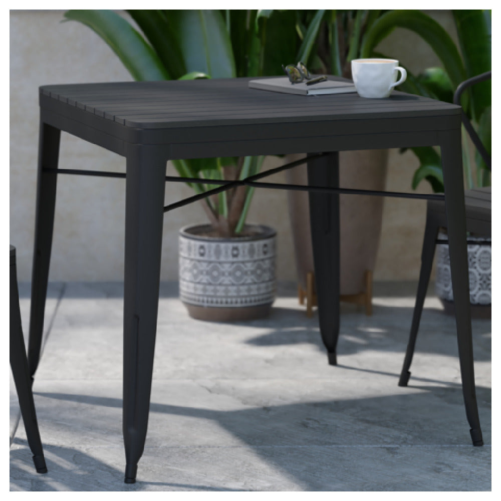 The Flash Furniture SB-T11T-BK-GG Helvey Patio Dining Table is a versatile square table designed for both indoor and outdoor settings, measuring 31-1/2" in width and depth and standing 28-1/4" high. It boasts a substantial weight capacity of 200 lbs, making it suitable for various uses across different market segments, such as residential patios needing durable outdoor furniture or commercial establishments like cafes and bistros requiring sturdy dining solutions. The table features a poly resin slatted top, ensuring durability and easy maintenance, while the e-coated steel frame with cross bracing enhances its stability and longevity. The addition of fixed floor glides ensures smooth placement and protection of flooring surfaces. Available in black, this table effortlessly complements any décor with its sleek design. This product stands out for its combination of robust construction and stylish appearance, meeting the demands of both aesthetic and functional requirements. Whether utilized in a bustling restaurant or a serene garden patio, it provides a practical and elegant dining solution.