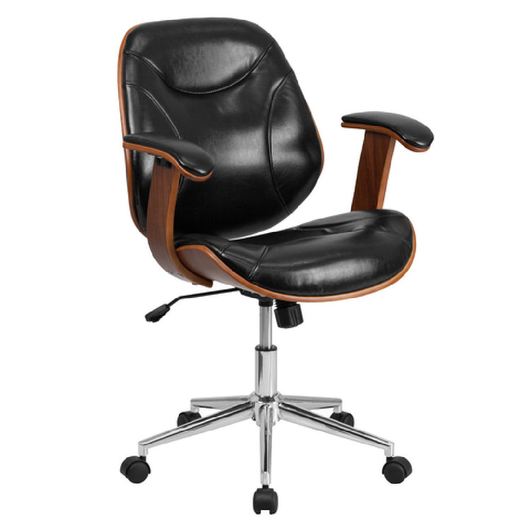 The Flash Furniture SD-SDM-2235-5-BK-GG Bentwood Executive Swivel Office Chair 35-1/2" to 38-1/2" Adjustable Height stands out for its sophisticated design and functional features, ideal for diverse professional environments. This mid-back chair is crafted with a contoured walnut back that not only offers a luxurious aesthetic but also complements the waterfall seat design for enhanced comfort. Its glossy LeatherSoft upholstery combines leather and polyurethane for added softness and durability. The chair supports a weight capacity of 250 lb, making it suitable for a wide range of users. For personalized comfort, it includes a tilt lock mechanism and tilt tension adjustment knob, along with built-in lumbar support to maintain proper posture. The padded arms ensure additional comfort during extended use. Its heavy-duty chrome base adds stability and is complemented by dual wheel casters for effortless mobility across different floor surfaces. Furthermore, the chair is equipped with CA117 fire retardant foam, ensuring compliance with safety standards. This executive office chair offers a blend of style, comfort, and functionality, making it a valuable addition to any corporate office, home workspace, or professional setting. Assembly is required, and in-stock items typically ship within 24 hours, ensuring quick availability.