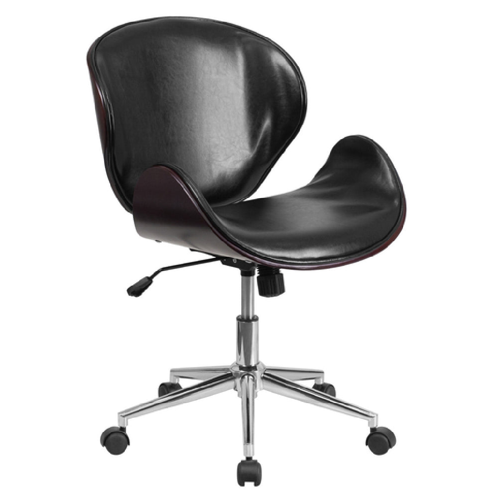 The Flash Furniture SD-SDM-2240-5-MAH-BK-GG Bentwood Swivel Conference Chair is a versatile seating solution, designed with functionality and style in mind. Featuring a mid-back design, this chair offers ergonomic support for extended periods of sitting, making it an ideal choice for conference rooms and office environments. The chair's adjustable height ranges from 32 inches to 35-1/4 inches, accommodating users of different heights and preferences. Its bentwood construction showcases a curved mahogany wood back and seat, providing a touch of elegance and sophistication. The upholstery is made of glossy LeatherSoft, a combination of leather and polyurethane, offering both comfort and durability. Equipped with a tilt lock mechanism and a tilt tension adjustment knob, users can customize their seating angle for optimal comfort. The chair is built to support up to 250 lbs, ensuring stability and reliability for various body types. A heavy-duty chrome base enhances the chair’s durability, while dual wheel casters facilitate smooth movement across different floor surfaces. Additionally, the chair includes CA117 fire retardant foam for added safety. With its combination of stylish design and practical features, the Flash Furniture Bentwood Swivel Conference Chair is an excellent choice for diverse professional settings.