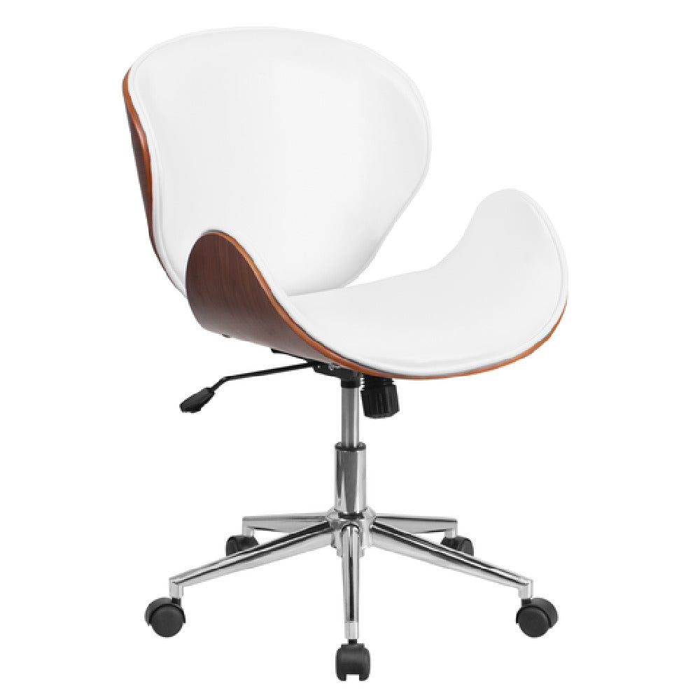 The Flash Furniture SD-SDM-2240-5-WH-GG Bentwood Swivel Conference Chair 32" to 35-1/4" Adjustable Height is a versatile seating solution designed for modern office environments. This chair stands out with its adjustable height range from 32 inches to 35-1/4 inches, catering to various desk heights and user preferences. The chair supports up to 250 pounds, ensuring robust durability. It features a mid-back design for ergonomic support, enhancing comfort during long meetings or work sessions. The curved walnut wood back and seat provide a sophisticated aesthetic, complemented by the glossy LeatherSoft upholstery that combines style with easy maintenance. Equipped with a tilt lock mechanism and a tilt tension adjustment knob, this chair offers customizable seating positions for optimal user comfort. The chair incorporates CA117 fire retardant foam, prioritizing safety in the workplace. Its heavy-duty chrome base adds stability, while dual wheel casters facilitate smooth mobility across office floors. Available in white, this chair requires assembly and is typically shipped within 24 hours for in-stock items. The Flash Furniture SD-SDM-2240-5-WH-GG chair is an ideal choice for conference rooms, executive offices, and collaborative workspaces, combining functionality with an elegant design.