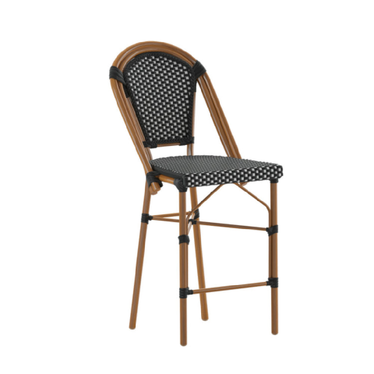 The Flash Furniture SDA-AD642001-CS-BKWH-NAT-GG Bordeaux Stacking French Bistro Stool is a versatile seating solution with a substantial weight capacity of 600 lbs, designed to meet the diverse needs of both residential and commercial settings. At a 26-inch counter seat height, it is perfectly suited for use at kitchen counters or bar areas. The stool features a stylish black and white polyethylene rattan back and seat, providing an elegant yet durable surface that is easy to maintain. Its natural finish bamboo print aluminum frame offers a robust and lightweight structure, ensuring both durability and ease of handling. Equipped with floor glides, this stool protects flooring surfaces and enhances stability. Designed for both indoor and outdoor use, it caters to various environments, from cozy home patios to busy café settings. The Bordeaux Stacking French Bistro Stool can be stacked up to five chairs high, allowing for efficient storage without requiring assembly. This makes it an ideal choice for establishments needing versatile and space-saving seating solutions. Its combination of aesthetic appeal and practical features makes it a standout option for those seeking both style and functionality in their seating arrangements.