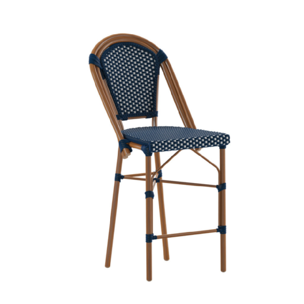 The Flash Furniture SDA-AD642001-CS-NVYWH-NAT-GG Bordeaux Stacking French Bistro Stool is a versatile seating solution combining durability and style. With a substantial weight capacity of 600 lb and a comfortable 26-inch counter seat height, this stool is engineered for both indoor and outdoor use. It features a navy and white polyethylene rattan back and seat, complemented by a natural finish bamboo print aluminum frame, offering a sophisticated aesthetic reminiscent of classic French bistro settings. The stool is designed with practical floor glides that ensure stability and protect flooring surfaces. One of its key advantages is its stackability—up to five stools high—facilitating easy storage and space efficiency, which is particularly beneficial for commercial establishments such as cafes, restaurants, and event venues where space optimization is crucial. This product arrives fully assembled, eliminating the hassle of setup and ensuring immediate usability. The combination of materials not only provides an elegant appearance but also ensures the stool's resilience against various weather conditions, making it a reliable choice for different market segments, including hospitality, retail, and residential environments seeking stylish yet practical seating options.