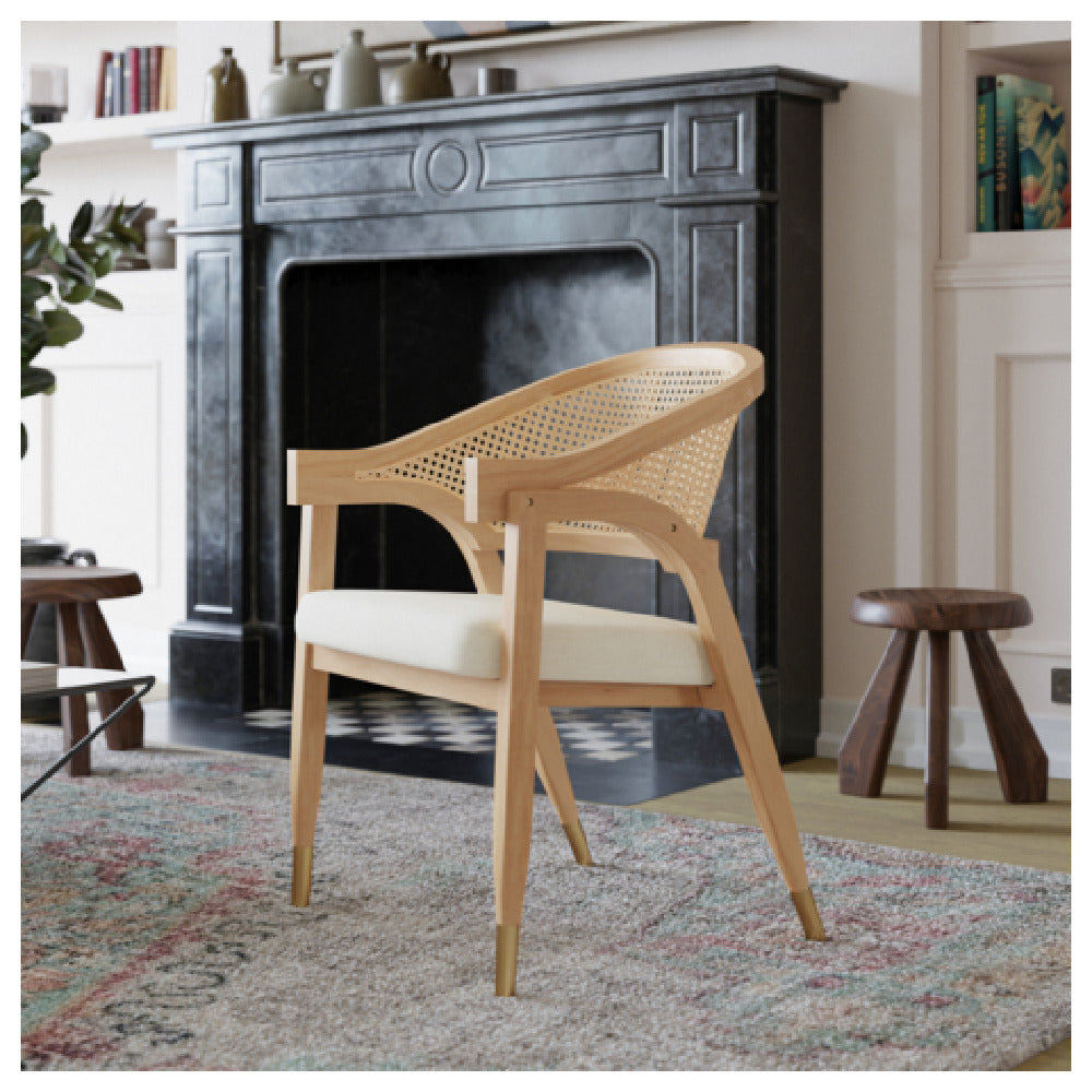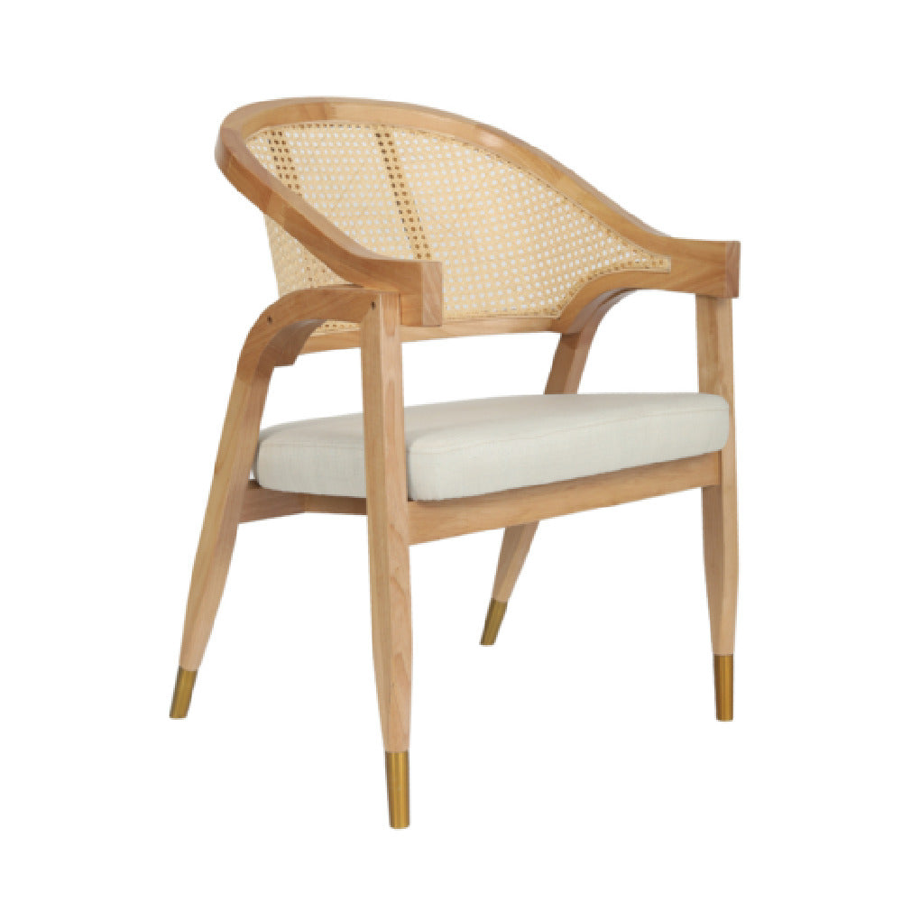 Flash Furniture SK-220901-NAT-GG Naomi Dining & Accent Chair is a versatile seating solution designed for commercial use, blending elegance with functionality. This chair features a distinctive cane rattan back that adds a touch of natural beauty, while its beige padded seat ensures a comfortable sitting experience. Constructed with a solid wood frame, the chair provides robust support and durability, making it suitable for various high-traffic environments such as restaurants, cafes, and event spaces. The gold-tipped legs add a sophisticated accent, enhancing its aesthetic appeal and making it a stylish addition to any setting. The natural finish of the chair complements a wide range of interior décors, providing both a timeless and contemporary look. With its combination of sturdy construction and elegant design, the Flash Furniture SK-220901-NAT-GG Naomi Dining & Accent Chair is an excellent choice for those looking to furnish their spaces with a product that balances practicality and style, serving the needs of different market segments in the hospitality and retail industries.