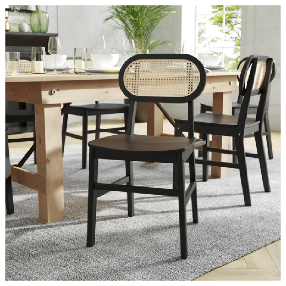 The Flash Furniture SK-220902-NATBLK-GG Jacob Dining & Event Chair is a versatile seating solution designed for commercial use, showcasing a blend of aesthetic appeal and durability. This chair features a stylish rattan back, providing both comfort and a touch of natural elegance that is suitable for a variety of settings, from sophisticated dining environments to dynamic event spaces. The solid wood seat and frame contribute to its sturdy construction, ensuring it can withstand the demands of frequent use in high-traffic areas. Available in a natural and black color scheme, this set of two chairs offers a contemporary yet timeless look that complements various interior styles. Crafted with the needs of the commercial market in mind, the Jacob Dining & Event Chair presents a unique value proposition, combining classic design elements with robust materials to deliver reliable performance and aesthetic versatility. Ideal for restaurants, banquet halls, and other venues requiring flexible seating arrangements, these chairs promise to enhance the ambiance while providing patrons with comfort and support. The thoughtful integration of design and functionality makes the Flash Furniture SK-220902-NATBLK-GG Jacob Chair a standout choice for businesses seeking to elevate their seating solutions.
