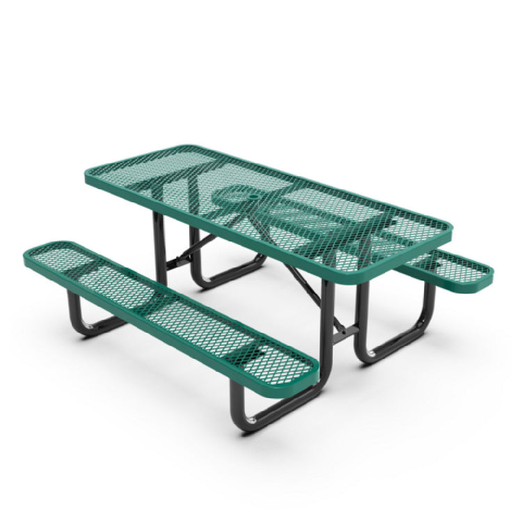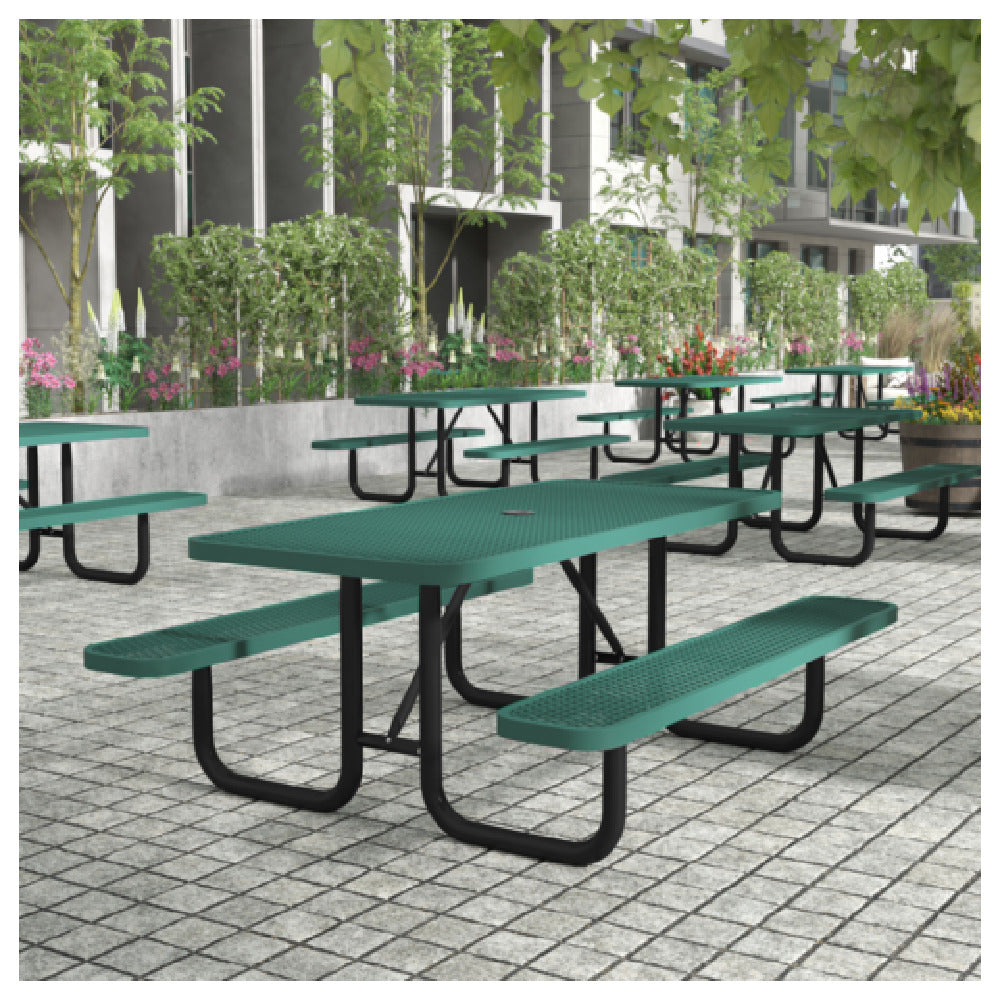 The Flash Furniture SLF-EML-72-GN-GG Mantilla Outdoor Picnic Table 6 ft. Rectangular is a robust and versatile solution for various outdoor settings. This picnic table features a commercial-heavy gauge expanded green metal mesh top and seats, providing durability and a modern aesthetic that complements any outdoor environment. The table's design integrates a black steel frame, ensuring sturdy construction and long-lasting performance, even in high-traffic commercial areas. With its 6-foot rectangular shape, this table offers ample space for dining and social gatherings, making it ideal for parks, schools, or corporate outdoor spaces. The metal mesh design not only offers strength but also allows for quick drainage of rainwater, maintaining its usability and appearance in diverse weather conditions. This picnic table caters to multiple market segments, from commercial outdoor spaces to educational institutions, by combining functionality with a sleek design. Its heavy-duty materials and construction make it a reliable choice for those seeking a balance of style and endurance in their outdoor furniture. The Flash Furniture SLF-EML-72-GN-GG Mantilla Outdoor Picnic Table is an excellent investment for any business or organization looking to enhance their outdoor areas with durable and attractive seating options.