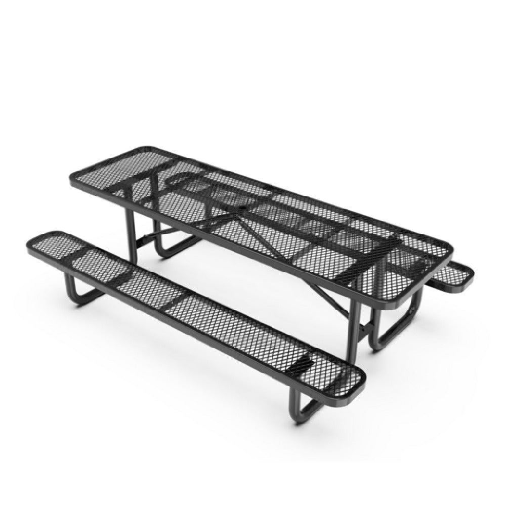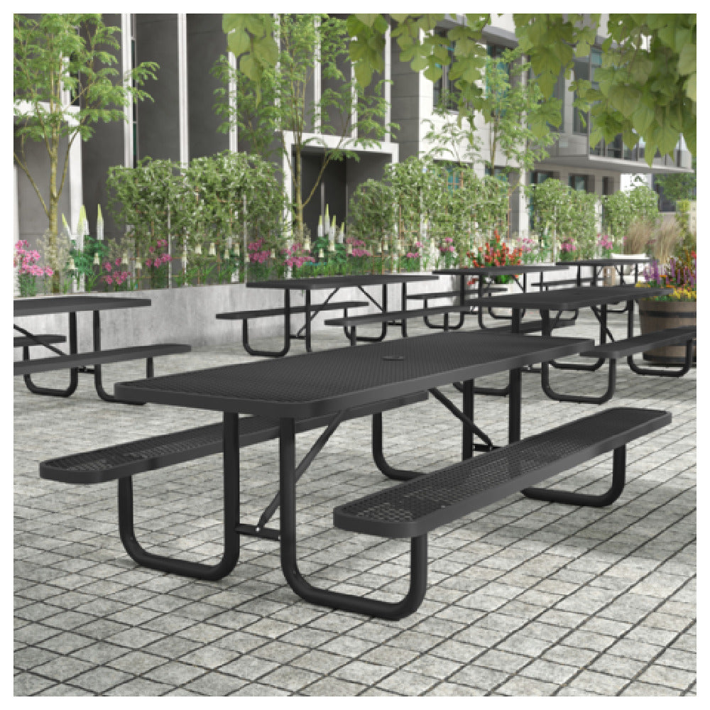 The Flash Furniture SLF-EML-96-BK-GG Mantilla Outdoor Picnic Table is an 8-foot rectangular table, designed with commercial-grade durability and functionality in mind. Featuring a heavy gauge expanded metal mesh top and seats, this picnic table ensures long-lasting performance and resilience against various environmental conditions. The table's black steel frame adds a sleek, modern aesthetic while providing robust structural integrity, making it suitable for a wide range of settings, from public parks to private backyards and commercial outdoor spaces. This table's design supports a large seating capacity, accommodating numerous guests comfortably, making it ideal for community gatherings or outdoor dining events. The use of expanded metal mesh not only contributes to the table's sturdy construction but also facilitates quick drainage and easy cleaning, ensuring maintenance is hassle-free. The heavy-duty construction and high-quality materials make the Flash Furniture SLF-EML-96-BK-GG Mantilla Outdoor Picnic Table a reliable choice for various segment markets, including hospitality, recreational, and educational sectors, where durability and functionality are paramount. Its versatile design and robust features cater to those seeking a practical and aesthetically pleasing outdoor furniture solution.