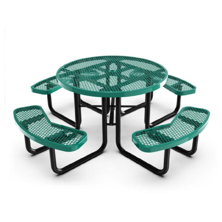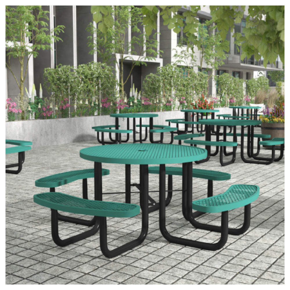 The Flash Furniture SLF-EMR-46-GN-GG Creekside Outdoor Picnic Table features a 46-inch diameter round design, perfectly suited for various outdoor environments. Engineered with commercial heavy gauge expanded green metal mesh, this picnic table offers sturdy and reliable seating and tabletop surfaces, ensuring longevity and resistance to wear. The inclusion of an umbrella hole within the table's design allows for easy installation of shade, enhancing comfort during usage. Built on a robust steel frame, this table is designed to support heavy use in commercial settings, making it ideal for parks, recreational areas, and commercial outdoor spaces. Its unique construction and durable materials cater to the needs of various segments within the outdoor furniture industry, providing a practical solution for those seeking quality and functionality. This picnic table's thoughtful design ensures it meets the demands of both functionality and aesthetic appeal, making it an excellent addition to any outdoor setting.