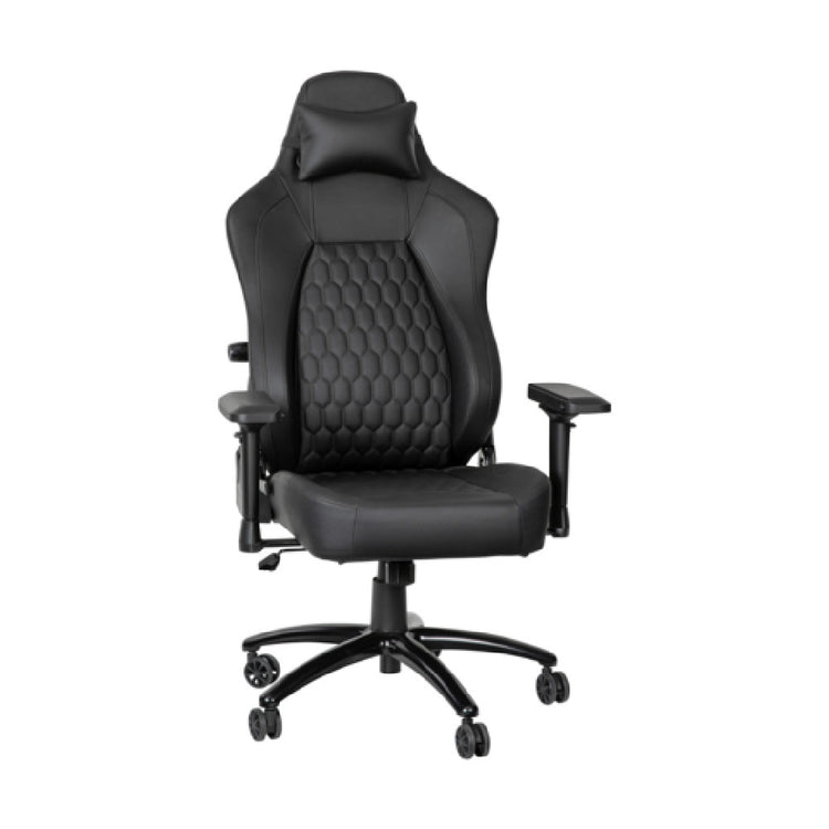The Flash Furniture SY-088-BK-GG Falcon Gaming Chair is a high-performance seating solution catering to various market segments in the gaming industry. With a 300 lb. weight capacity, this chair is designed for durability and comfort, featuring LeatherSoft upholstery that combines the elegance of leather with the softness of fabric, enhancing both aesthetics and user experience. The high-back design supports extended use, while the removable headrest pillows and built-in lumbar support provide tailored ergonomic benefits, reducing strain during prolonged gaming sessions. Its 4D armrests allow for comprehensive adjustability, catering to individual preferences for arm placement. The pneumatic seat height adjustment ensures users can modify the chair height for optimal position and posture. The chair includes a tilt lock mechanism and a tilt tension adjustment knob, offering users the flexibility to recline and lock the chair in multiple positions. Supported by a chrome base and racing-style casters, the chair delivers both stability and smooth mobility across various surfaces. Available in black, the Falcon Gaming Chair is an assembly-required product, designed to meet the demanding needs of professional gamers, streamers, or anyone seeking a premium seating experience with customizable features for enhanced comfort and performance.