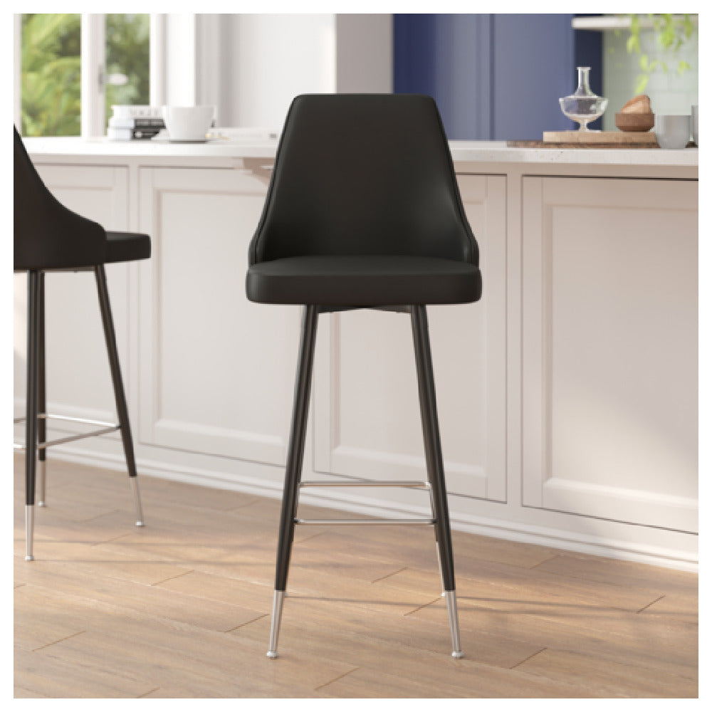 Flash Furniture SY-807-30-BK-GG Shelly Bar Stool is a distinctive seating solution designed to combine modern style with high functionality. This bar stool boasts a bar height with a 30-inch seat height, perfectly complementing elevated counters and bar tables. Engineered to support up to 300 pounds, it ensures stability and durability, making it suitable for various environments such as home kitchens, restaurant bars, or casual dining spaces. The LeatherSoft upholstery offers a sophisticated look while providing comfort, thanks to its bucket style back and seat that cradle the user. High density foam padding further enhances the seating experience by offering plush support. A robust steel frame with chrome feet and integrated footrests underscores the stool's contemporary aesthetic while providing exceptional strength. The adjustable floor glides enhance usability by ensuring stability on uneven surfaces. This product comes in a set of two and requires assembly, catering to those who appreciate a cohesive and modern aesthetic in their seating arrangements. Finished in black, this stool aligns with a variety of decor styles, offering a versatile seating option that blends seamlessly into any setting.