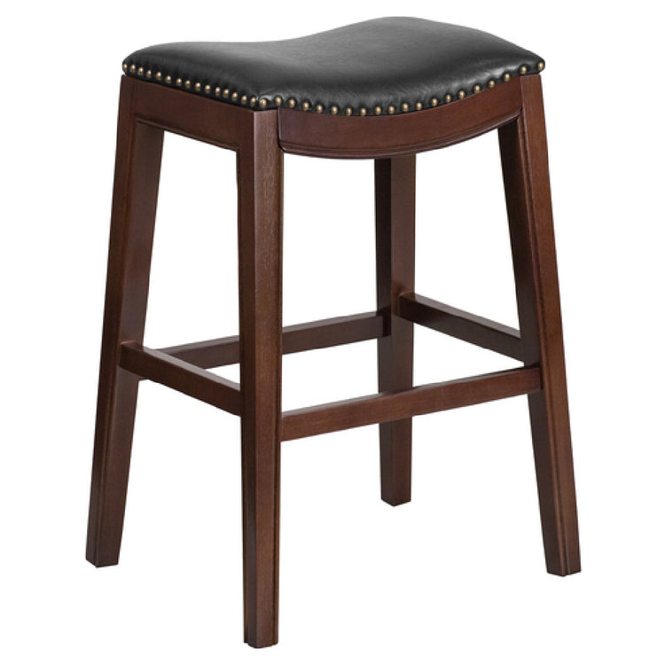 The Flash Furniture TA-411030-CA-GG Bar Stool 30"H Seat Backless is an expertly crafted piece that seamlessly combines style and functionality, tailored for residential settings. This bar stool features a 30-inch high, backless design, making it a versatile choice for a variety of dining and entertainment spaces. The upholstered saddle seat is adorned with elegant nailhead trim, providing a touch of sophistication while ensuring comfort. Constructed from a sturdy wood frame with a rich cappuccino finish, this stool adds a warm and inviting aesthetic to any room. The inclusion of CA117 fire retardant foam speaks to its safety and durability, meeting fire safety standards. Black LeatherSoft upholstery enhances its luxurious appeal, combining leather and polyurethane for added softness and longevity. A footrest is incorporated into the design, offering additional comfort, while protective floor glides ensure your floors remain unscathed. Designed for residential use, this transitional style stool requires assembly. It is readily available, with in-stock items typically shipping within 24 hours, making it a convenient choice for those seeking to elevate their space with a functional and elegant seating solution.