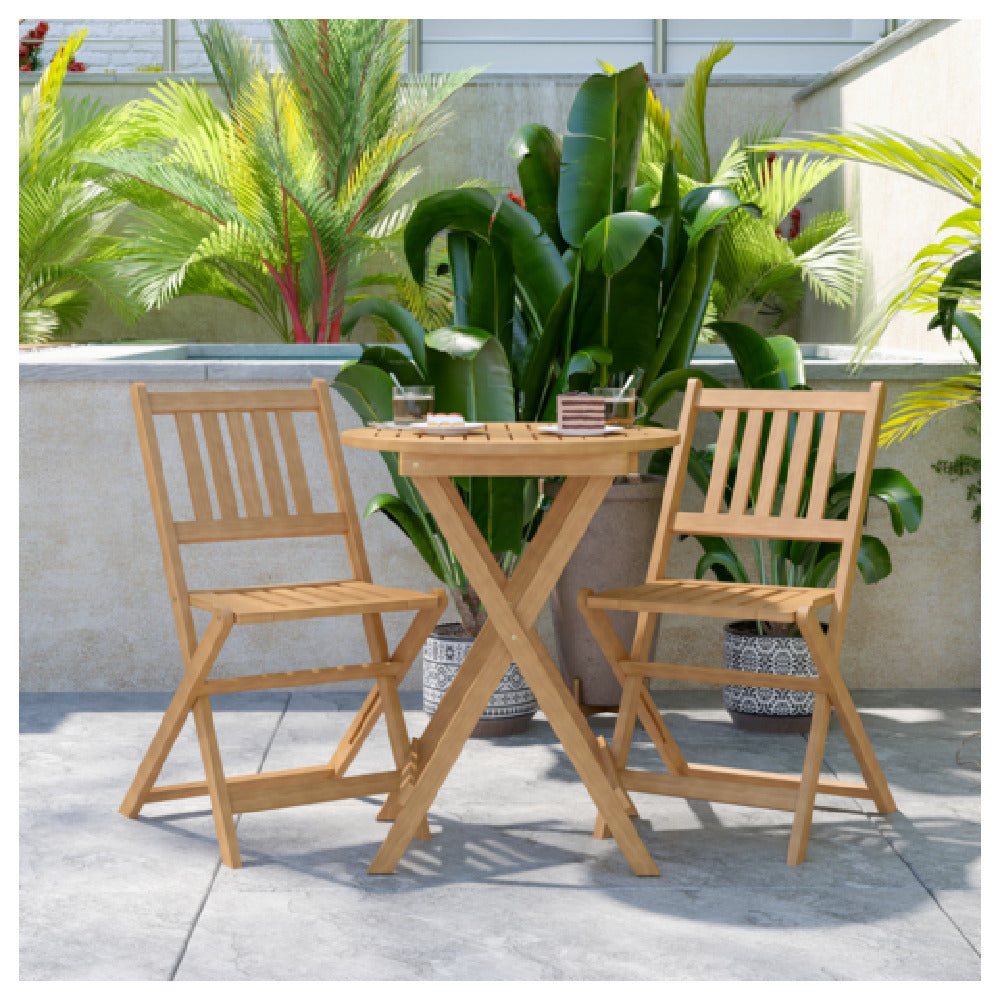 Flash Furniture THB-S4460-NAT-GG Martindale 3 Piece Folding Patio Bistro Set Indoor/Outdoor Acacia Round Wood Table And 2 Chair Set With Slatted Design is a versatile and elegant choice for both indoor and outdoor settings. Crafted from durable acacia wood, this set comprises a round table and two chairs, all featuring a natural finish that enhances its aesthetic appeal. The slatted design not only adds a touch of sophistication but also ensures water drainage, making it ideal for outdoor use. This bistro set is designed with practicality in mind, as all pieces are foldable, allowing for easy storage and portability. The natural finish of the acacia wood provides resistance to the elements, ensuring longevity and minimal maintenance. This set caters to a variety of market segments, from residential patios and balconies to commercial settings like cafes and restaurants, where flexible seating solutions are in demand. The compact design makes it a perfect choice for smaller spaces, while the robust construction ensures it can withstand frequent use, making it a valuable addition to any environment seeking to combine functionality with style.