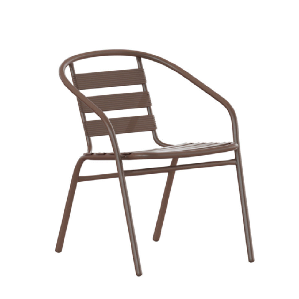The Flash Furniture TLH-017C-BZ-GG Lila Restaurant/Patio Stacking Armchair is a versatile seating solution designed for both indoor and outdoor environments, offering a substantial weight capacity of 352 pounds. It features a curved triple slat aluminum ladder back that not only adds aesthetic appeal but also provides ergonomic support. The chair's textured aluminum seat is designed for comfort and durability, while its sturdy steel frame ensures long-lasting performance. Cross braces enhance stability, making it suitable for high-traffic areas such as restaurants and patios. With the convenience of plastic floor glides, the chair minimizes damage to flooring surfaces, making it an ideal choice for various settings. Its lightweight construction allows for easy maneuverability and stacking capability, accommodating up to 22 chairs for efficient storage. Finished in a stylish bronze color, the armchair ships fully assembled, ensuring immediate usability upon delivery. This product's quick shipping time, often within 24 hours for in-stock items, makes it a reliable option for businesses requiring prompt service. The Flash Furniture TLH-017C-BZ-GG Lila armchair combines practicality with modern design, making it a valuable asset for hospitality venues, cafes, and outdoor dining spaces.