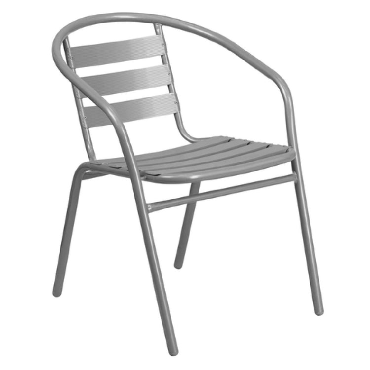The Flash Furniture TLH-017C-GG Restaurant/Patio Stacking Armchair 352 Lb. Weight Capacity is an exemplary seating solution tailored for both restaurant and patio settings, highlighting its robust 352 lb. weight capacity. Crafted for versatility, this chair boasts a curved triple slat aluminum ladder back, offering both durability and ergonomic comfort. The textured aluminum seat adds an additional layer of comfort while ensuring a modern aesthetic. Built with a cross brace and a sturdy steel frame, this chair is designed for longevity and resilience. Plastic floor glides protect flooring surfaces, making it suitable for both indoor and outdoor use. Its lightweight nature allows it to stack up to 22 chairs high, providing convenient storage and space efficiency. Finished in a sleek silver color, the chair ships fully assembled, ready for immediate use. This feature, coupled with its generally quick shipping time of within 24 hours for in-stock items, makes it an efficient choice for businesses seeking reliable seating solutions. The Flash Furniture TLH-017C-GG chair stands out in the market for its combination of function, durability, and sleek design, making it a preferred choice for various industry segments seeking quality and efficiency in seating.