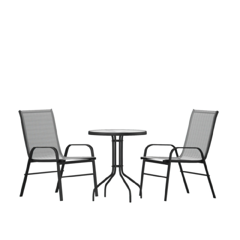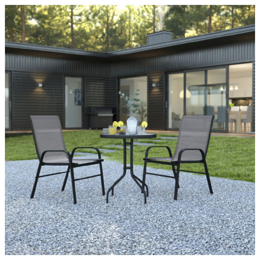 Flash Furniture TLH-0701303C-GY-GG Brazos 3 Piece Outdoor Patio Dining Set combines functional design with style, featuring a 23.75-inch round tempered glass patio table and two gray Flex Comfort stack chairs. The set emphasizes durability and modern aesthetics, making it a versatile addition to various outdoor spaces ranging from home patios to commercial outdoor dining areas. The tempered glass table top not only ensures a sleek appearance but also offers enhanced safety and strength, capable of withstanding diverse weather conditions. Meanwhile, the Flex Comfort stack chairs provide both comfort and convenience, designed for easy stacking and storage when not in use. The gray color scheme adds a neutral, sophisticated touch, blending effortlessly with different outdoor decors. This patio dining set is particularly valuable for individuals and businesses seeking an efficient use of space, thanks to its compact table size and stackable chair design. Whether used for residential relaxation or in a bustling café setting, the Flash Furniture TLH-0701303C-GY-GG Brazos 3 Piece Outdoor Patio Dining Set delivers on both functionality and style, catering to a broad range of outdoor environments.