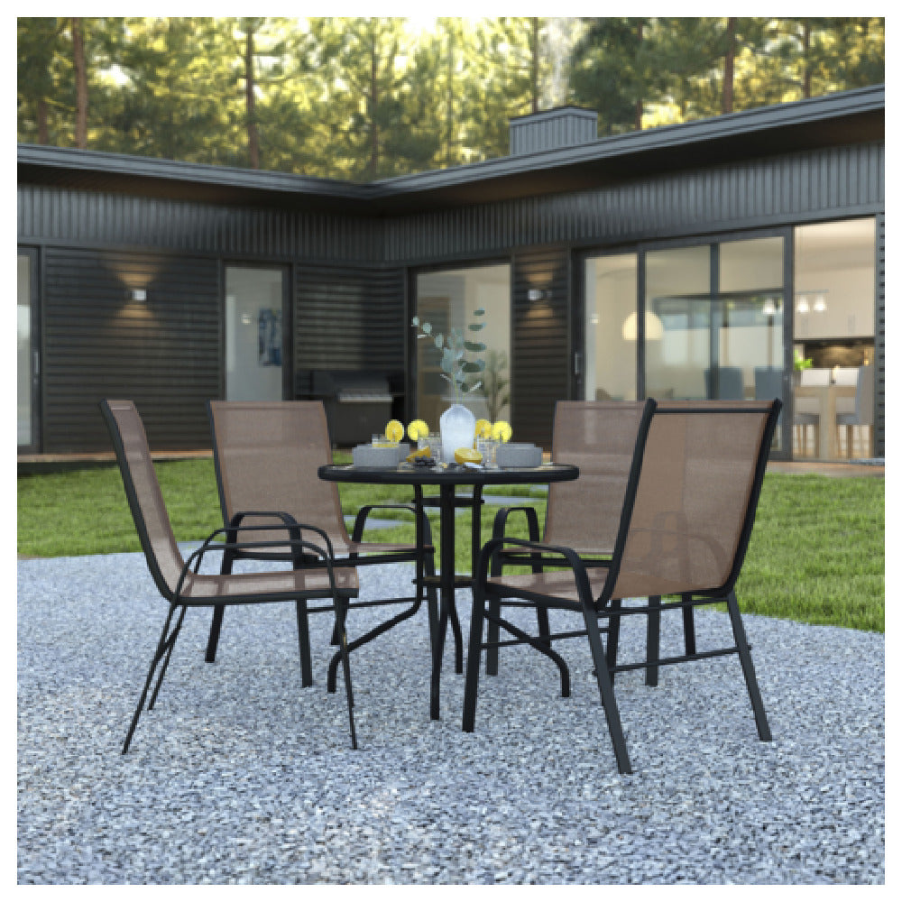The Flash Furniture TLH-0702303C-BN-GG Brazos 5 Piece Outdoor Patio Dining Set is a versatile and stylish addition to any outdoor space. Featuring a 31.5-inch round tempered glass patio table, this set combines elegance with durability, making it suitable for a variety of outdoor settings. The set includes four brown Flex Comfort stack chairs, which offer both comfort and convenience with their stackable design, ideal for easy storage. This dining set is designed to cater to diverse market segments, including homeowners looking to enhance their patio experience, as well as businesses in the hospitality industry seeking durable and attractive outdoor furniture solutions. The tempered glass table provides a stable and easy-to-clean surface, while the brown Flex Comfort chairs are engineered for prolonged outdoor use. The harmonious blend of modern aesthetics and practical functionality ensures that the Flash Furniture Brazos 5 Piece Outdoor Patio Dining Set meets the needs of those seeking a reliable and stylish outdoor dining solution. Its compact size makes it perfect for smaller patios or balcony settings, offering a comfortable dining experience without compromising on style or quality.
