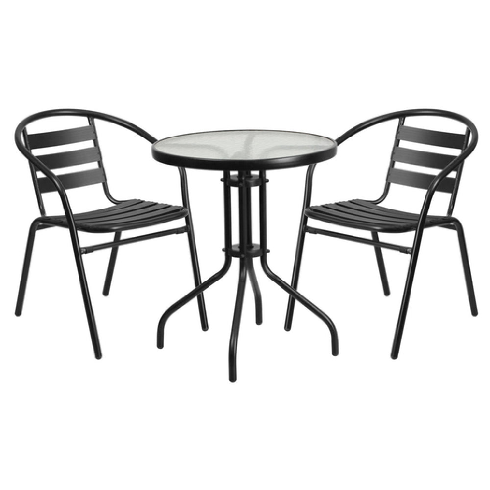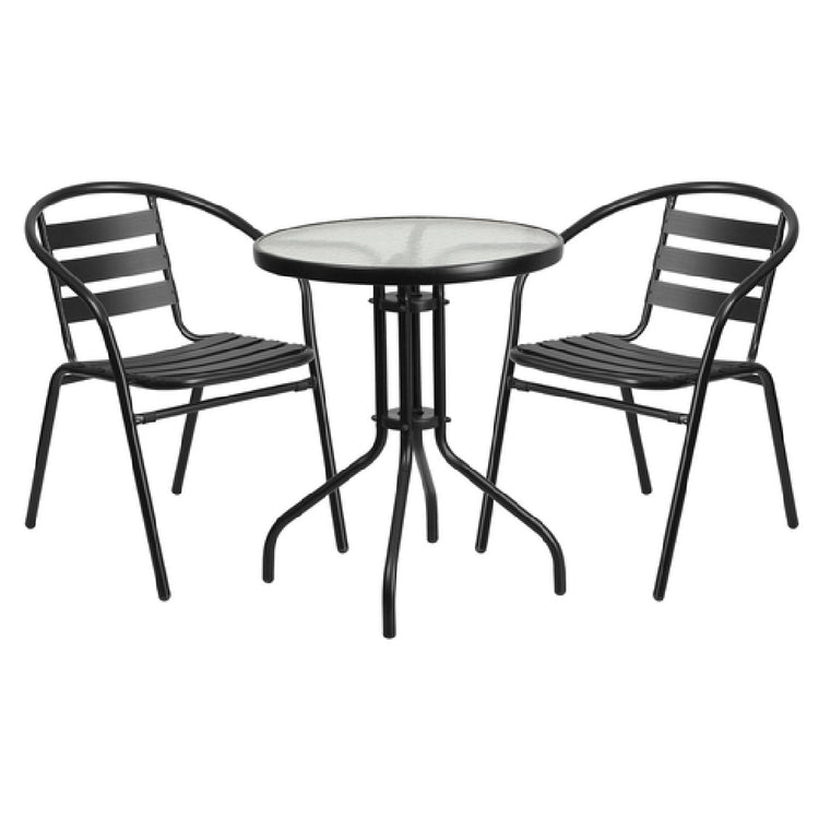 The Flash Furniture TLH-071RD-017CBK2-GG Table & Chair Set is a thoughtfully designed ensemble that is suitable for a variety of settings, from cozy indoor spaces to vibrant outdoor patios. This set includes a round table with a diameter of 23-3/4 inches and a height of 28 inches, featuring a sturdy 5mm thick glass top with a 1-1/4 inch edge, all supported by a black powder-coated metal base. This construction ensures durability while maintaining a sleek aesthetic. The table is complemented by two stacking café armchairs, each designed with a curved back and a distinctive black aluminum triple slat back. The chairs also boast a black textured seat and a resilient black powder-coated metal frame. Both the table and chairs are equipped with protective plastic floor glides, ensuring they are gentle on floors while maintaining stability. Lightweight for easy mobility and assembly, this furniture set is designed for both indoor and outdoor use, offering flexibility for various environments. Shipped in two boxes, this set is usually dispatched within 24 hours if in stock, making it a convenient and stylish choice for both residential and commercial spaces seeking quality and functionality.
