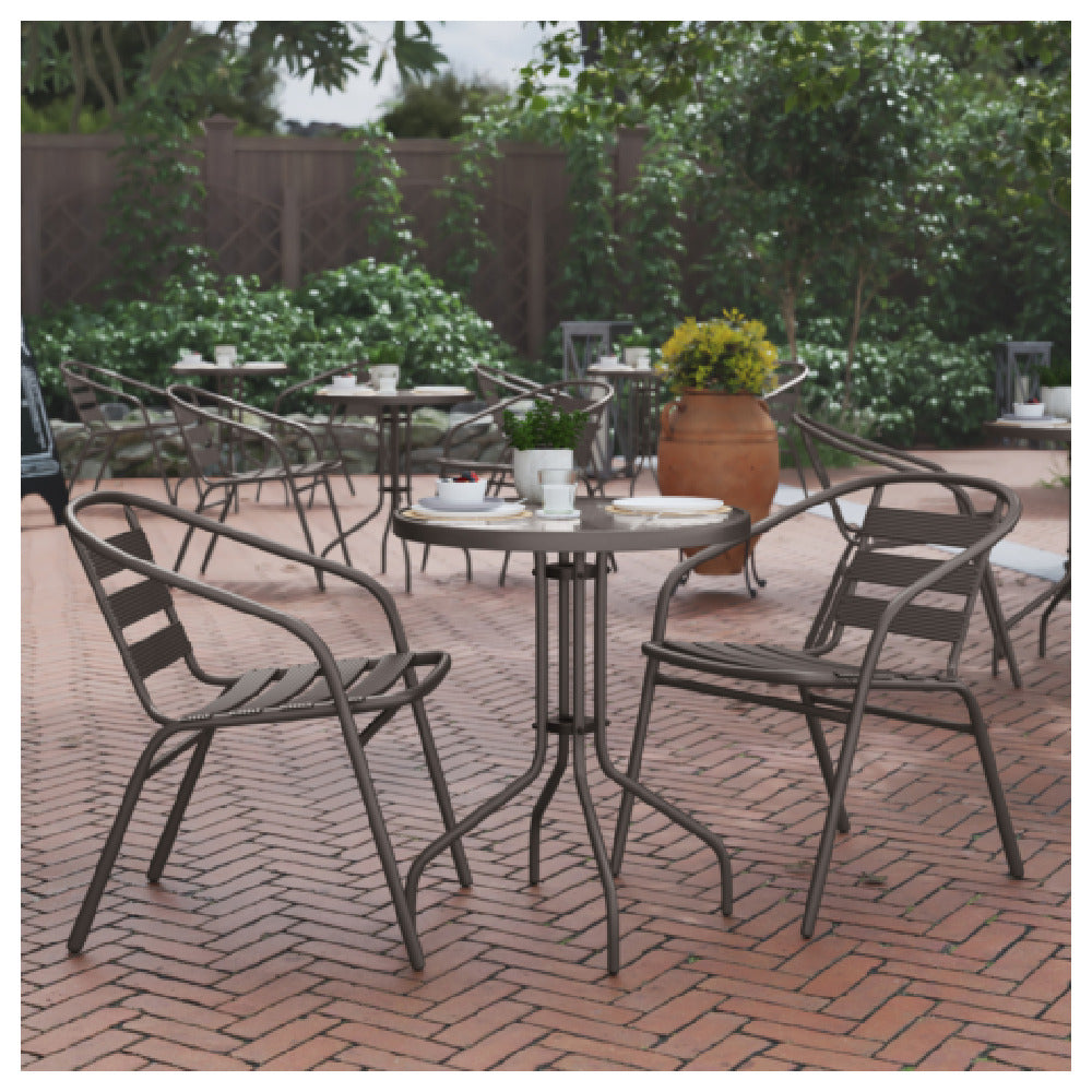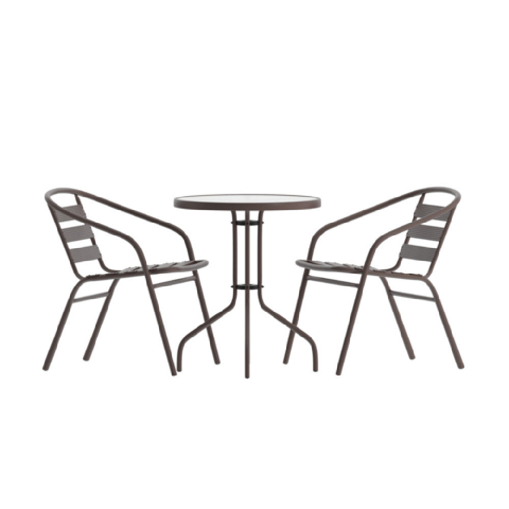 The Flash Furniture TLH-071RD-017CBZ2-GG Lila Table & Seat Set features a sophisticated design with a 23-3/4" diameter glass top metal table that combines elegance and functionality. This table is complemented by two bronze aluminum slat stack chairs, offering both style and durability for various environments. The metal table's sleek glass surface provides a modern touch, seamlessly integrating into both indoor and outdoor settings, making it a versatile choice for cafes, patios, and small dining areas. The bronze aluminum slat chairs are not only aesthetically pleasing but also designed for stacking, allowing for easy storage and space-saving when not in use. This set's construction ensures it withstands different weather conditions, making it ideal for both residential and commercial use. Its compact size fits well in smaller spaces, ensuring that it caters to diverse market segments seeking practicality and style in their furniture selection. The Flash Furniture Lila Table & Seat Set stands out with its combination of a durable glass top and robust metal frame, offering a reliable option for those in need of a versatile and elegant seating solution.