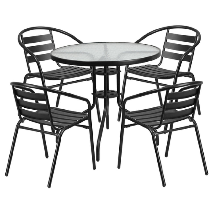 The Flash Furniture TLH-072RD-017CBK4-GG Table & Chair Set includes a well-designed combination of a 31-1/2" diameter x 28"H round table and four stacking cafe armchairs, tailored for both indoor and outdoor settings. The table features a 5 mm thick glass top with a 1-3/8" thick edge, ensuring durability and elegance. Its black powder-coated metal base is equipped with protective plastic floor glides to prevent scratches on various flooring types. The included armchairs feature a curved black design with a black aluminum triple slat and a black textured seat, supported by cross braces and a black powder-coated metal frame, contributing to their lightweight yet sturdy construction. This set is shipped in two boxes, with in-stock items usually dispatched within 24 hours, and requires assembly upon arrival. The thoughtful design of this furniture set makes it an ideal solution for cafes, restaurants, and home patios, providing a blend of style and functionality tailored to diverse market segments seeking reliable and aesthetically pleasing seating solutions.