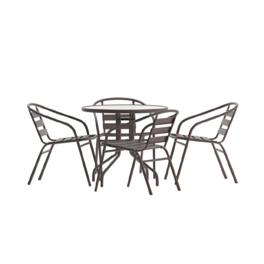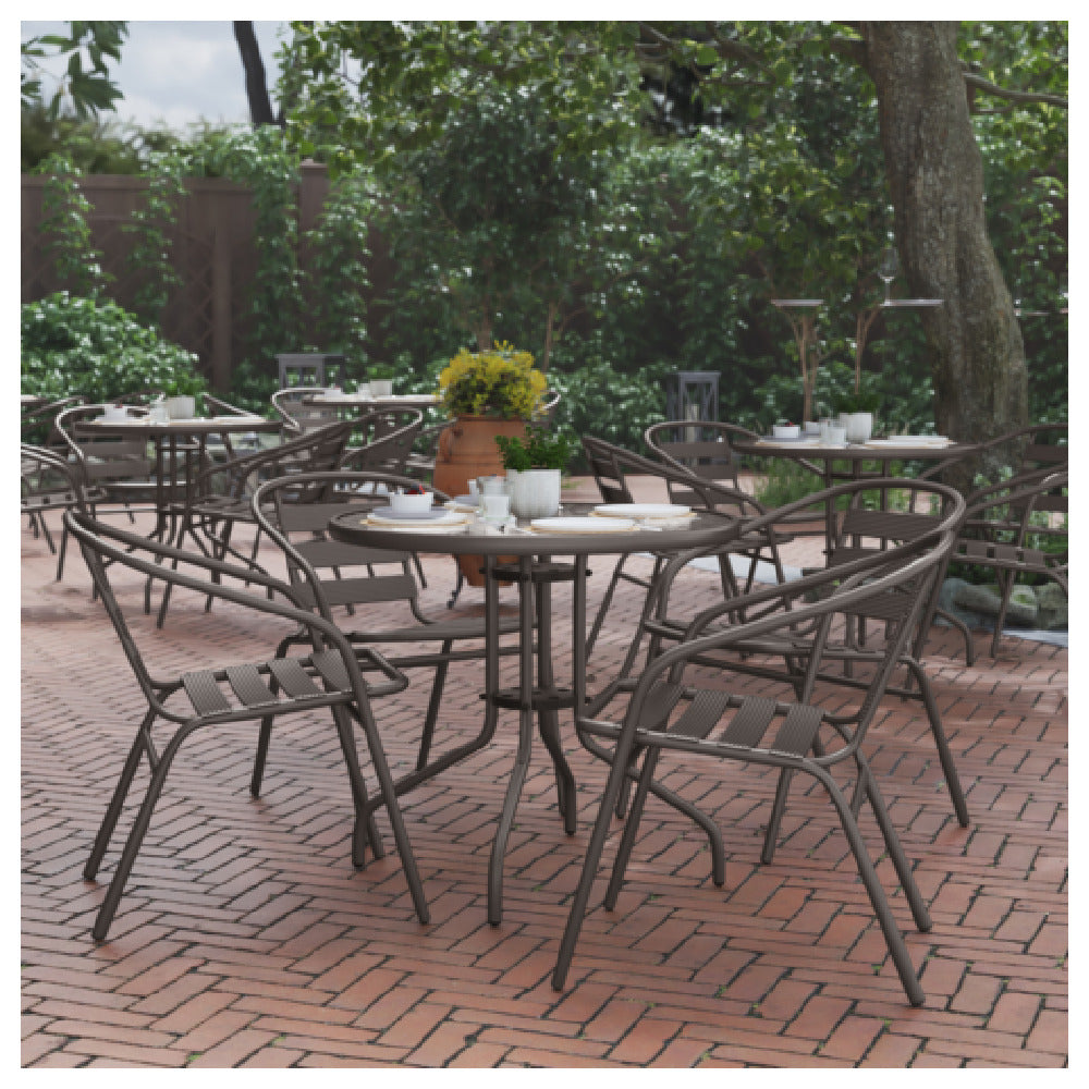The Flash Furniture TLH-072RD-017CBZ4-GG Lila Table & Seat Set is an elegantly designed ensemble perfect for both residential and commercial use. This set features a round metal table with a 31-1/2" diameter glass top, offering a sleek and contemporary aesthetic. The glass top not only provides a spacious surface area for dining or meetings but also adds a touch of sophistication and ease of cleaning. Accompanying the table are four bronze aluminum slat stack chairs, known for their durability and lightweight design, making them easy to stack and store when not in use. This combination of materials ensures the set's resilience against weather conditions, making it suitable for both indoor and outdoor settings. The bronze finish of the chairs complements the modern look of the table, while their slat design allows for comfortable seating and adequate support. This table and seat set is an excellent choice for cafes, patios, or even dining rooms, offering versatility and style. Its practical design and high-quality materials make it a reliable option for various market segments, from hospitality to home furnishings, emphasizing both function and form in any setting.