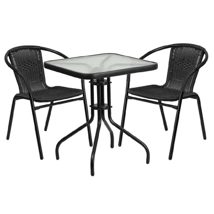 The Flash Furniture TLH-0731SQ-037BK2-GG Table & Chair Set is a versatile furniture solution designed for both indoor and outdoor settings, catering to diverse market segments such as cafes, patios, and small dining areas. This set includes a square table measuring 23-1/2 inches in width and depth, with a height of 28 inches. The table features a 5mm thick glass top and a sturdy black powder-coated metal base, ensuring durability and sleek aesthetics. It comes equipped with protective plastic floor glides to prevent floor damage. Alongside the table, the set includes two stacking cafe armchairs, each constructed with a curved black rattan back and seat, supported by cross braces and a black powder-coated metal frame. These chairs are lightweight, enhancing their portability and stackability, which is ideal for flexible seating arrangements. The inclusion of plastic floor glides on the chairs also serves to protect flooring surfaces. Assembly is required for this set, which is shipped in two boxes, and in-stock items are typically dispatched within 24 hours. This comprehensive table and chair set stands out for its combination of aesthetic appeal, functional features, and adaptability to various environments.