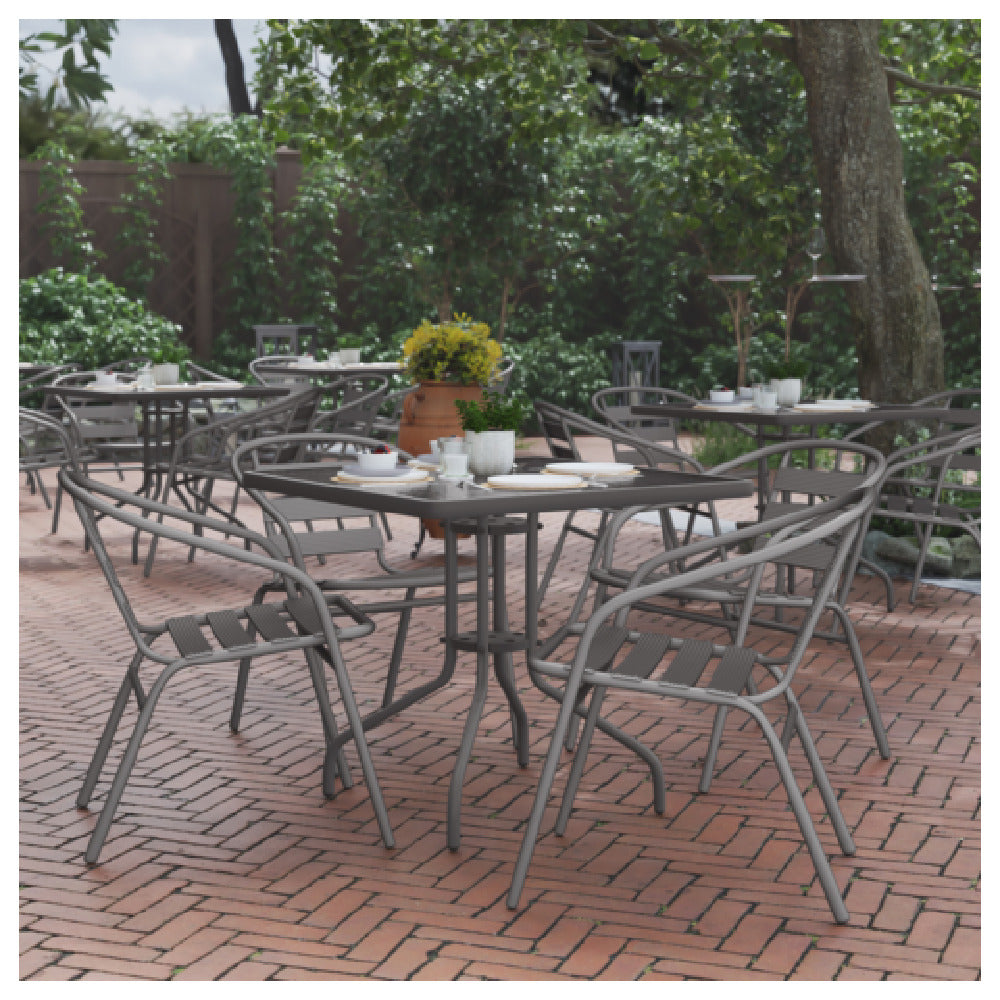 The Flash Furniture TLH-0732SQ-017CSV4-GG Lila Table & Seat Set presents a well-crafted blend of functionality and style, featuring a 31-1/2" by 31-1/2" square glass top metal table. This table is complemented by four silver aluminum slat stack chairs, offering a cohesive aesthetic that fits seamlessly into various environments. The design caters to both commercial and residential spaces, making it suitable for cafes, patios, and dining areas where durability and elegance are paramount. The glass top provides a sleek, modern look while being easy to clean and maintain, ensuring longevity. The silver aluminum chairs are stackable, allowing for convenient storage and space management, which is particularly advantageous for businesses that require flexible seating arrangements. The robust construction of both the table and chairs ensures stability and wear resistance, which is essential for high-traffic areas. Overall, the Flash Furniture Lila Table & Seat Set is an excellent option for those seeking a stylish yet practical furniture solution that meets the demands of diverse market segments within the hospitality and home furnishing industries.