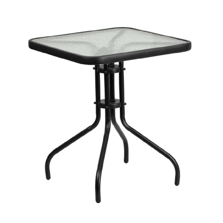 The Flash Furniture TLH-073A-1-GG Patio Table is a square outdoor piece measuring 23-1/2 inches by 23-1/2 inches with a height of 28 inches, offering a compact and functional design for various settings. It features a 5mm thick tempered glass top, ensuring durability and a sophisticated look. The table's 1-1/2 inch edge adds stability and style, enhancing its robust construction. Built with a black powder-coated metal base, it combines strength with a sleek aesthetic, suitable for both indoor and outdoor environments. Protective plastic floor glides are integrated into the design, safeguarding floors from scratches and ensuring easy movement across different surfaces. This patio table requires assembly but provides a quick and straightforward setup process. With its versatile use options, the Flash Furniture TLH-073A-1-GG is an ideal choice for homeowners looking to enhance their patio spaces, as well as businesses in the hospitality industry seeking to furnish outdoor dining areas efficiently. This product is readily available, with in-stock items typically shipping within 24 hours, making it a convenient choice for immediate needs. Its combination of technical specifications and thoughtful design makes it a valuable addition to any environment.