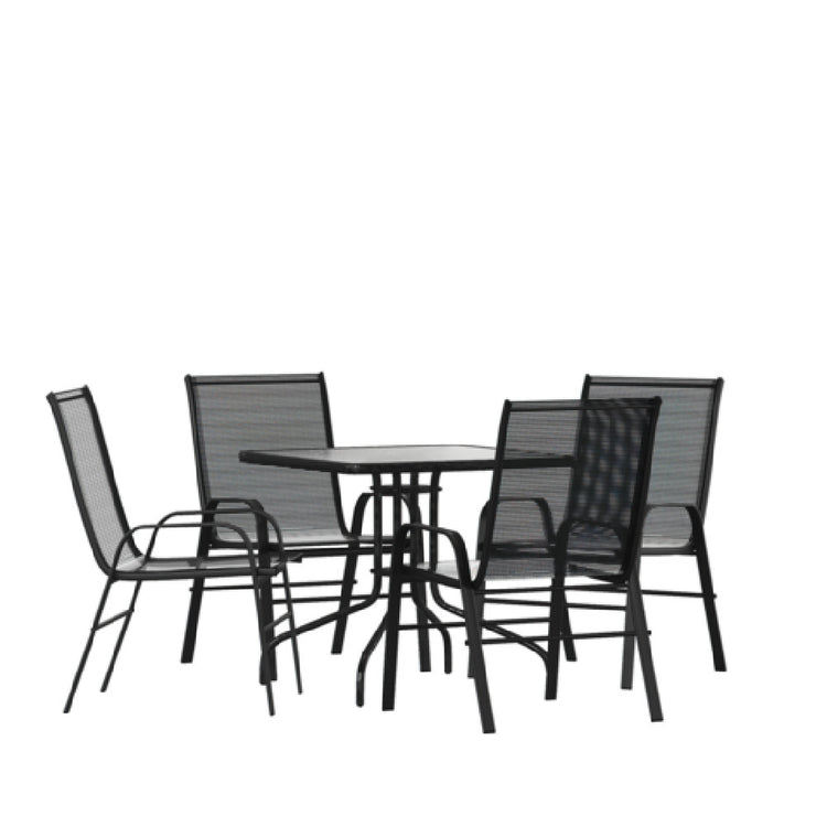 The Flash Furniture TLH-073A2303C-GG Brazos 5 Piece Outdoor Patio Dining Set - 31.5" Square Tempered Glass Patio Table is a stylish and practical addition to any outdoor living space. This set includes a robust 31.5-inch square tempered glass patio table, designed to withstand outdoor conditions while providing a sleek and modern look. Accompanying the table are four Black Flex Comfort Stack Chairs, which are crafted for both durability and comfort, making them perfect for extended outdoor dining experiences. The stackable design of the chairs allows for easy storage and space-saving convenience when not in use. This dining set is ideal for various market segments, including residential spaces looking to enhance their patio dining experience, and commercial establishments like cafes or restaurants that wish to offer an elegant outdoor seating option. The combination of tempered glass and durable seating provides a unique value proposition by blending aesthetic appeal with functional design, making it a versatile choice for different settings. The Flash Furniture TLH-073A2303C-GG Brazos set is perfect for those who value both style and functionality in their outdoor furniture selections.