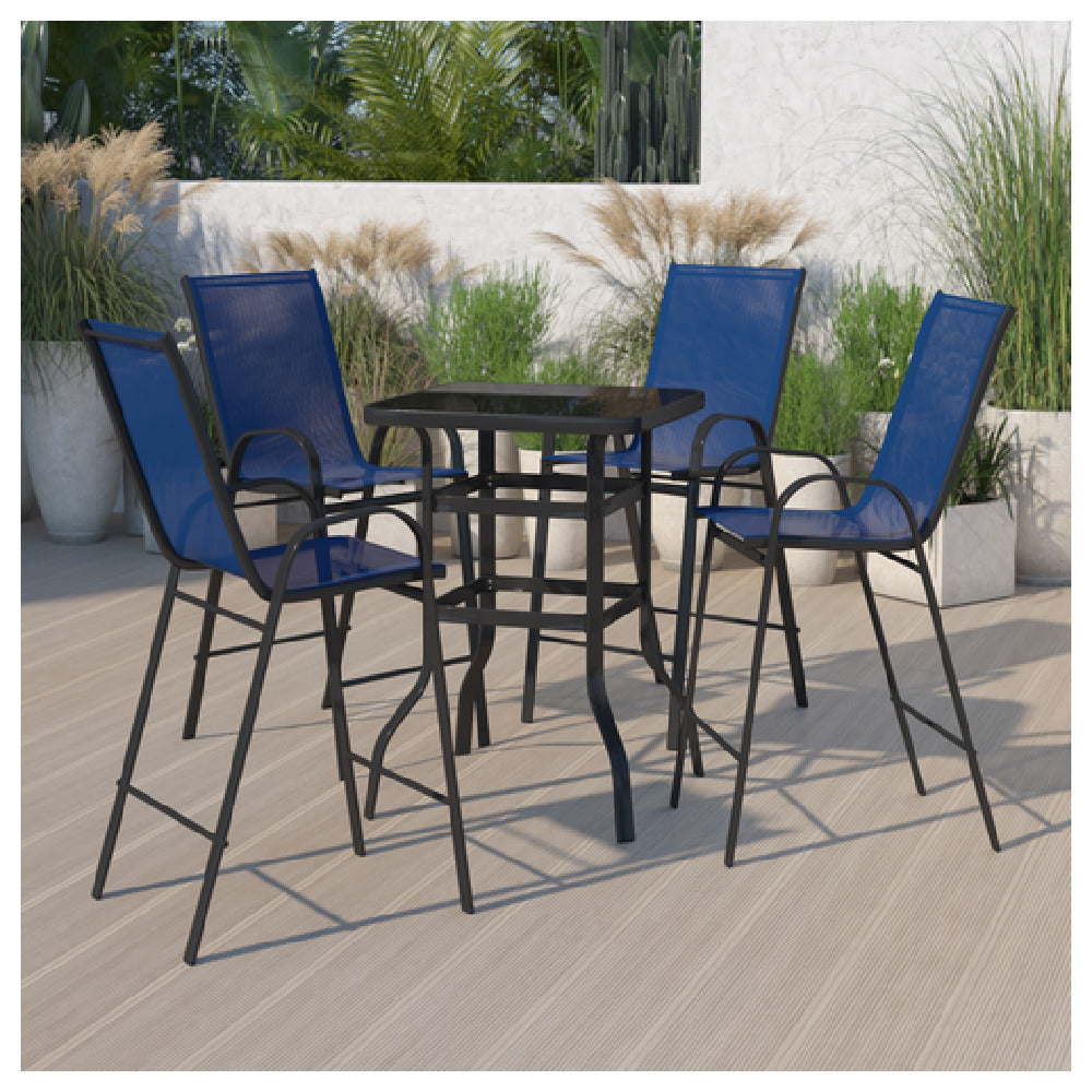 The Flash Furniture TLH-073H092H4-NV-GG Outdoor Dining Set - a 4-person bistro ensemble - includes one glass bar table complemented by four navy stools, creating a stylish and functional outdoor dining solution. The bar table features a clear tempered glass top, offering not only a sleek, modern look but also durability and resistance to outdoor elements. The welded powder coated steel frame provides robust support and longevity, ensuring the set withstands the test of time and varying weather conditions. Each piece is designed with floor protector plastic glides, safeguarding your patio or deck surfaces from scratches or damage. This dining set is particularly appealing to those seeking both aesthetics and functionality in their outdoor spaces, making it a versatile choice for homeowners, hospitality businesses, or commercial venues. The navy stools add a touch of elegance and color to the setting, while the compact size of the bistro set efficiently accommodates smaller areas without compromising on style or comfort. Whether for a cozy family gathering in a residential garden or an inviting seating arrangement in a café's outdoor area, the Flash Furniture TLH-073H092H4-NV-GG Outdoor Dining Set stands out as an optimal selection for those in search of quality and design excellence.